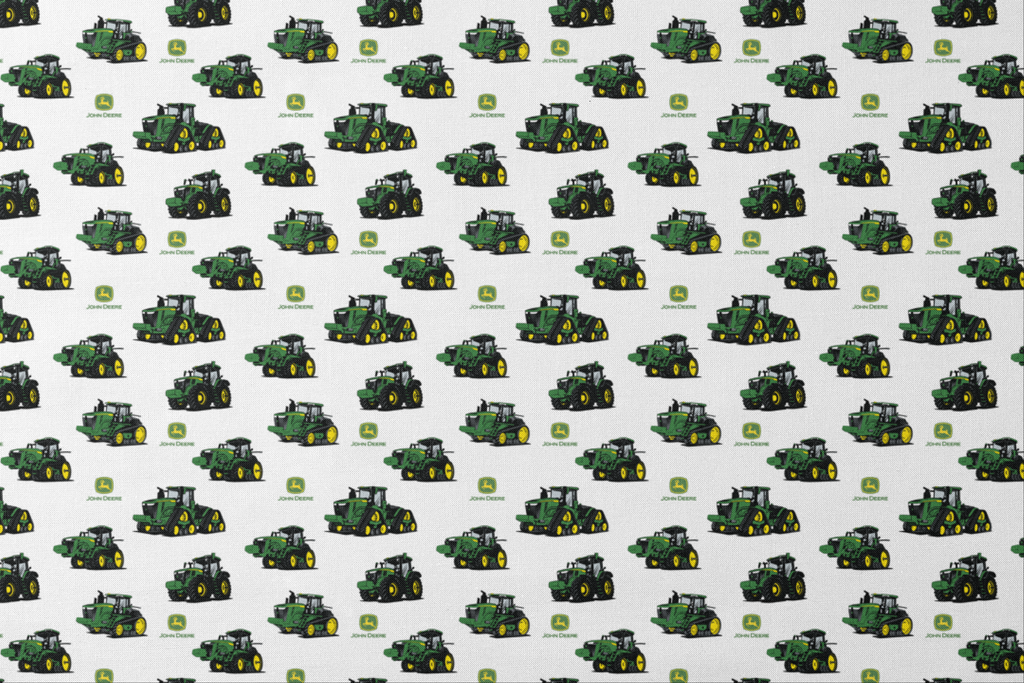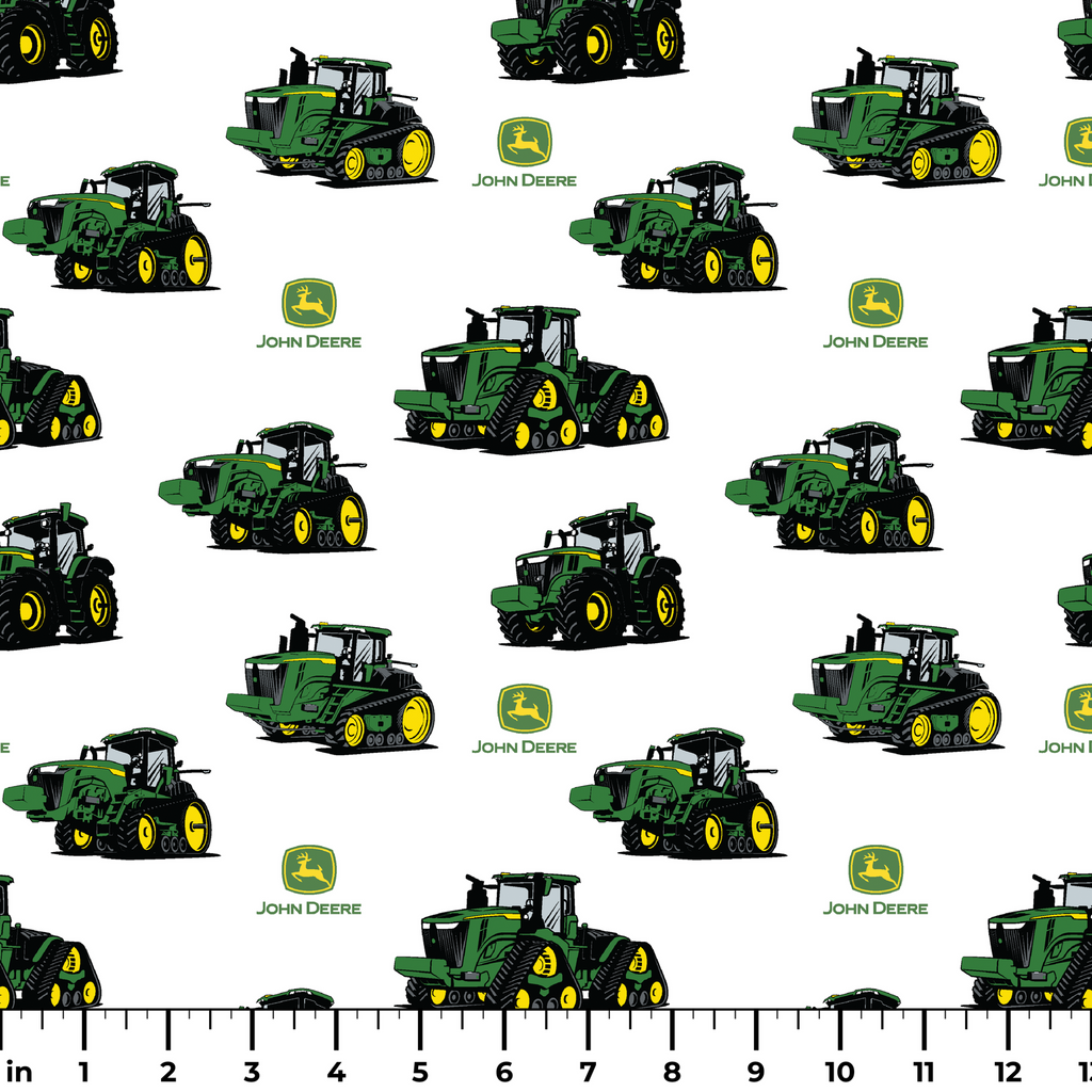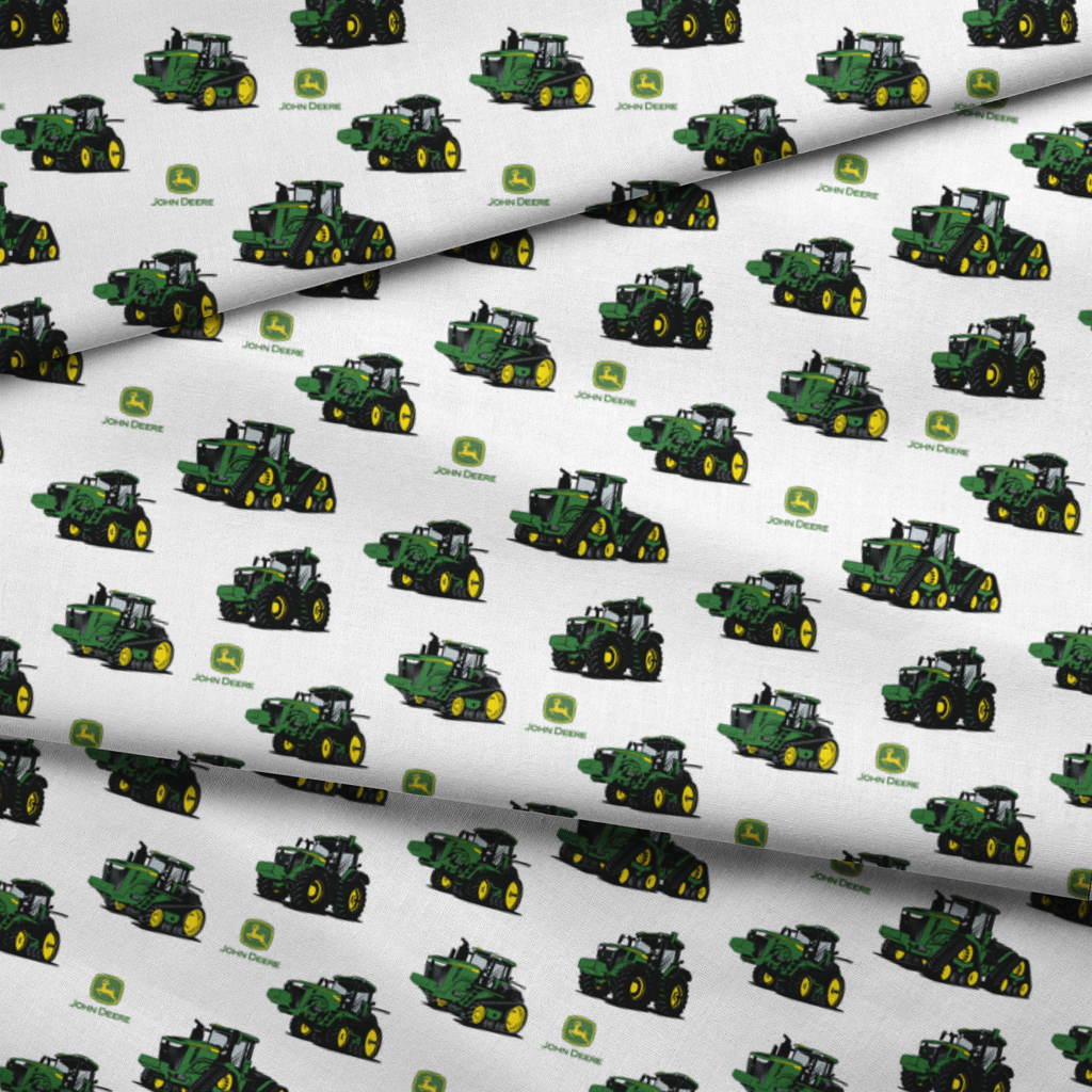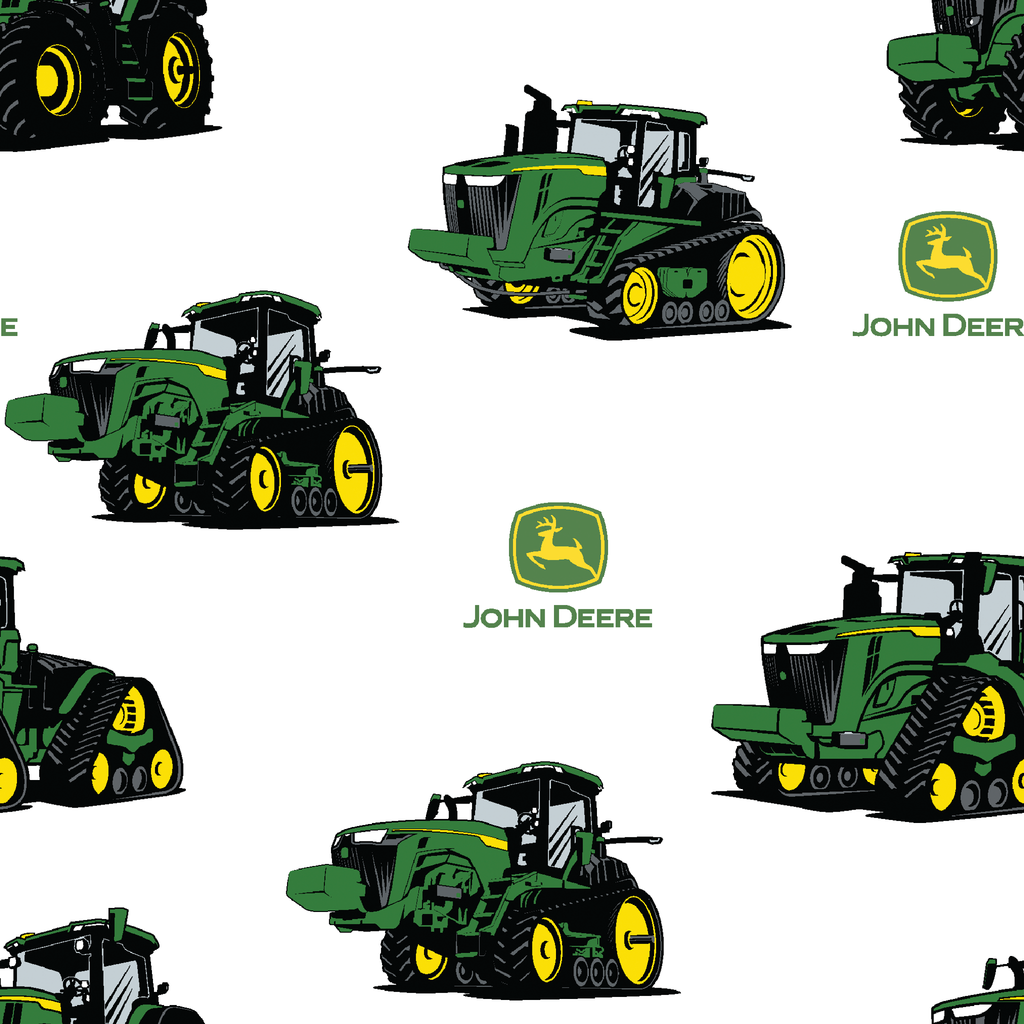 Bold green tractors with signature yellow wheels roll across this crisp white background, showcasing detailed John Deere tractors. The iconic deer logo punctuates the design, adding authenticity to these powerful agricultural machines. Perfect for quilts, pillows, or special projects for the farming enthusiast or little ones who dream of wide open fields and big machinery.