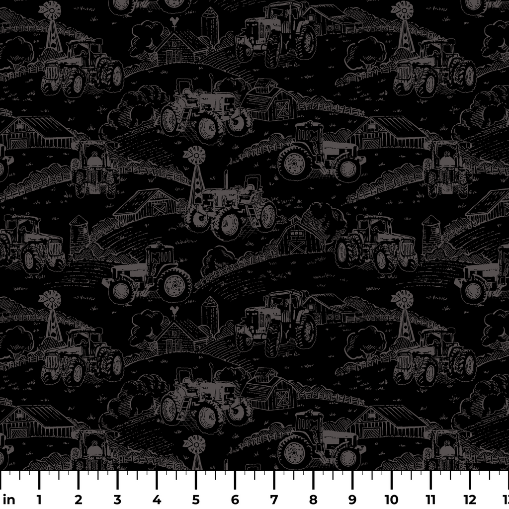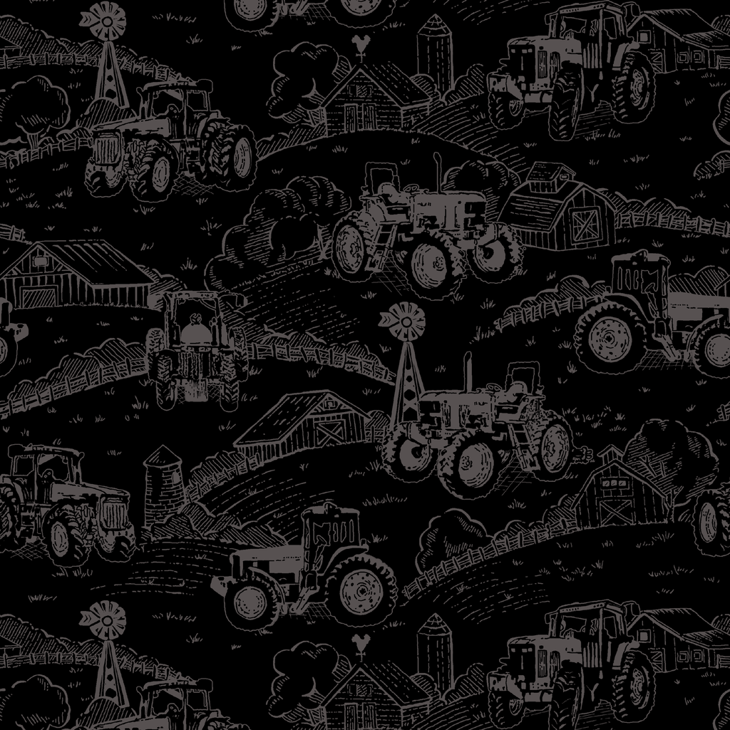 Classic John Deere farm scenes come to life in this striking black and charcoal gray tractor pattern on a deep black background. Vintage-style tractors rumble across rolling farmland, complete with charming barns, windmills, and countryside fencing sketched in a nostalgic hand-drawn style. This rugged fabric would make perfect quilts for tractor enthusiasts or cozy pillows for a farm-themed bedroom—bringing a touch of rural charm to any space.