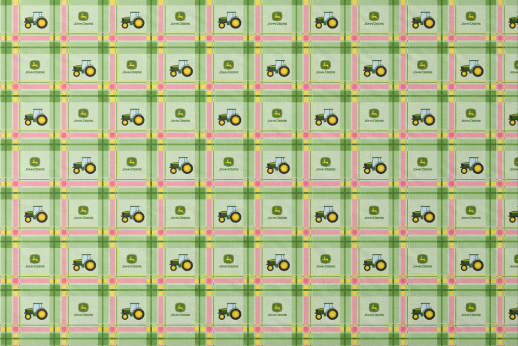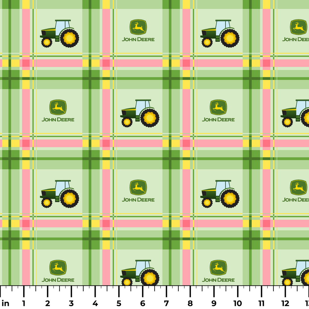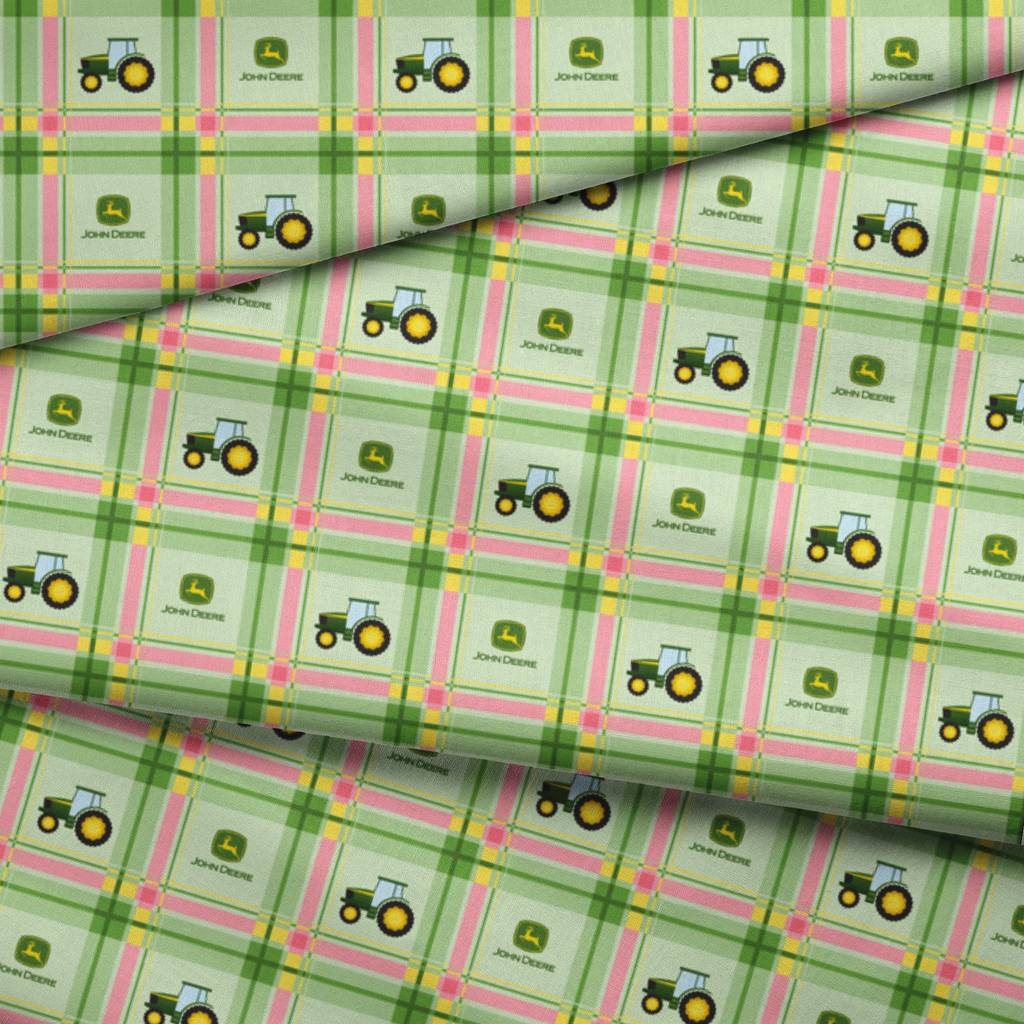 This cheerful plaid fabric features iconic John Deere tractors and logos displayed on a soft pastel background of light green, pink, and sunny yellow. The classic green tractors with bright yellow wheels bringing farm charm to your sewing projects. Perfect for creating quilts, tote bags, or playroom accessories for the little tractor enthusiast in your life.