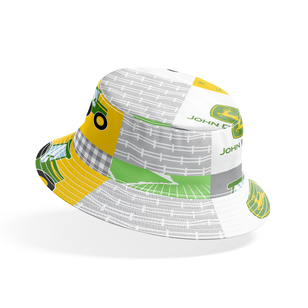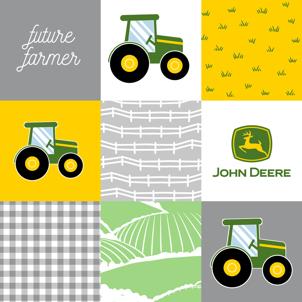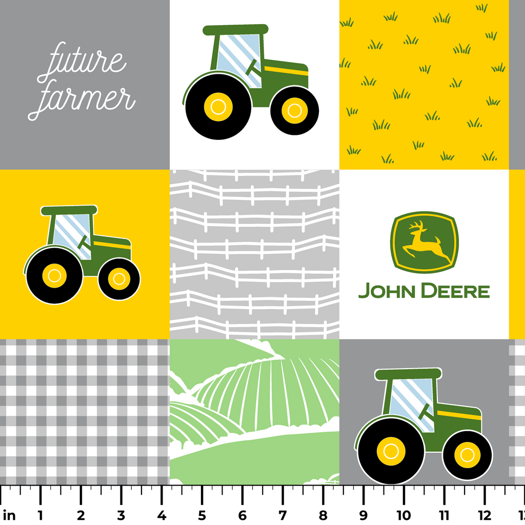 This charming patchwork design features John Deere tractors in green and yellow tones, with a "future farmer" message and farm field patterns perfect for children's decor or nursery themes.