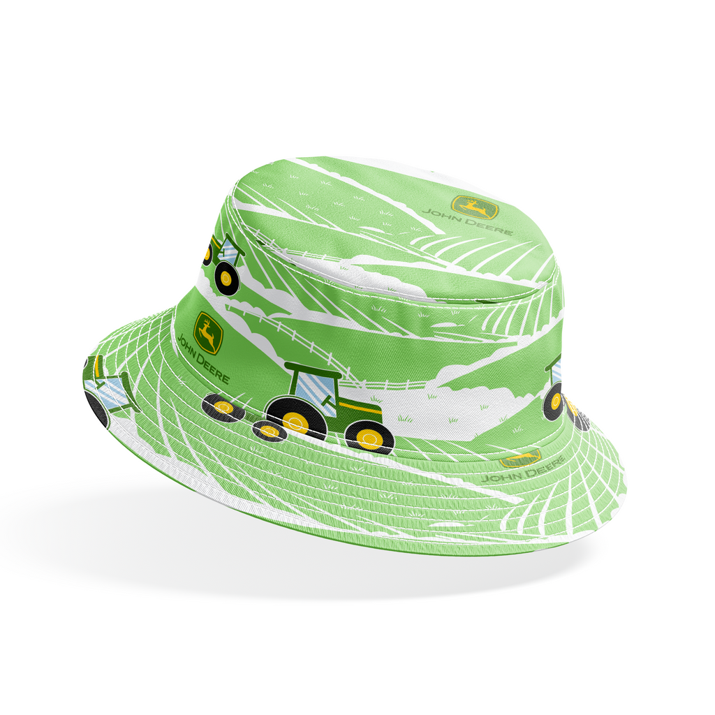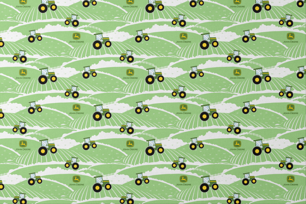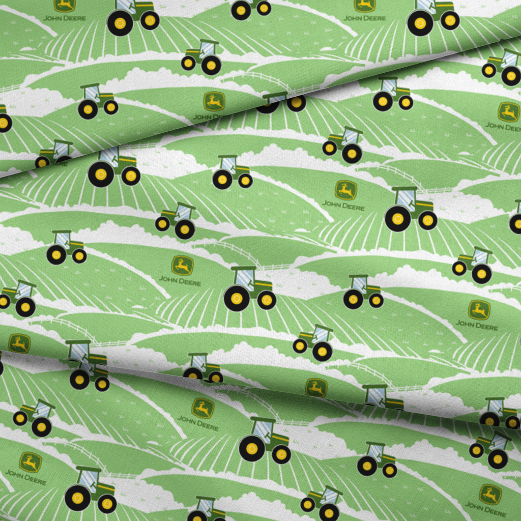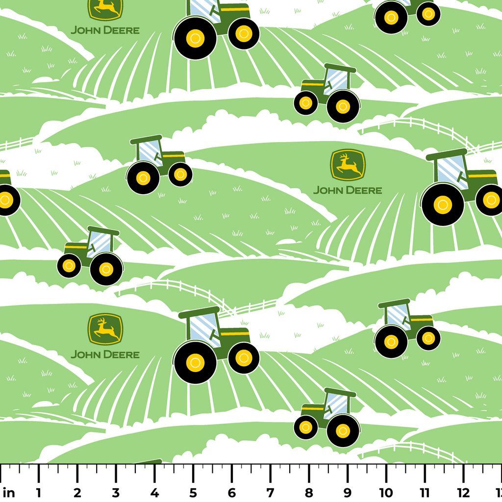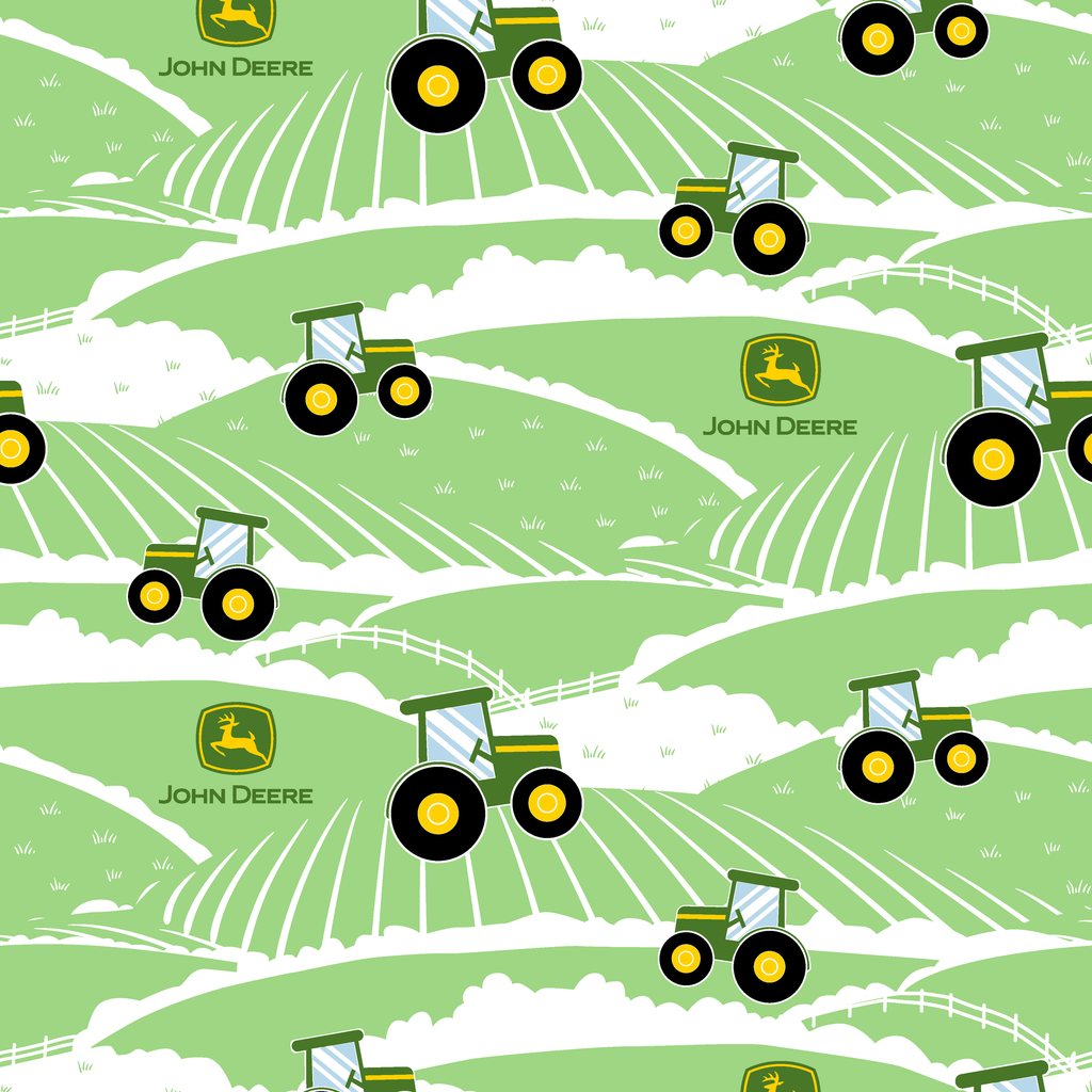 Iconic John Deere tractors pattern in green and yellow, featuring farm equipment on rolling agricultural fields with white fences - perfect for farming enthusiasts and country decor.