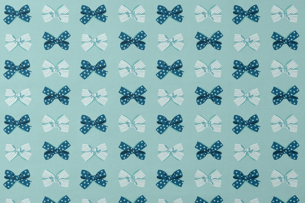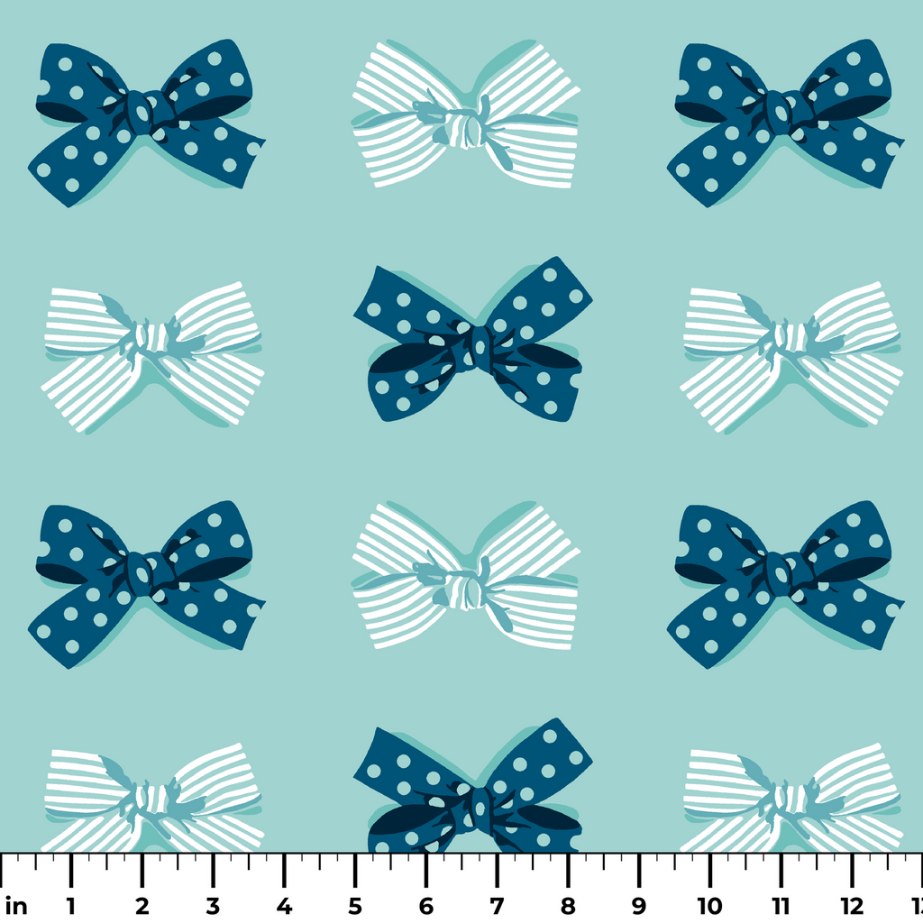 Classic polka dot and striped bows in blue and white against a seafoam background. Perfect for craft, apparel, and quilt projects.