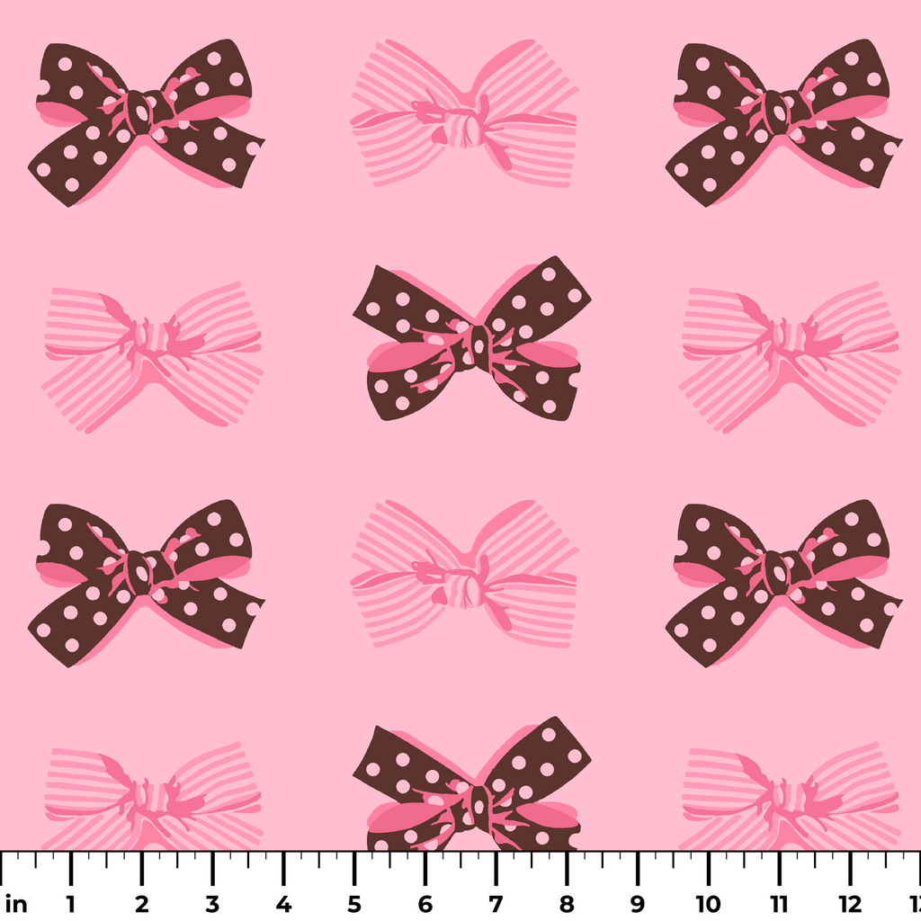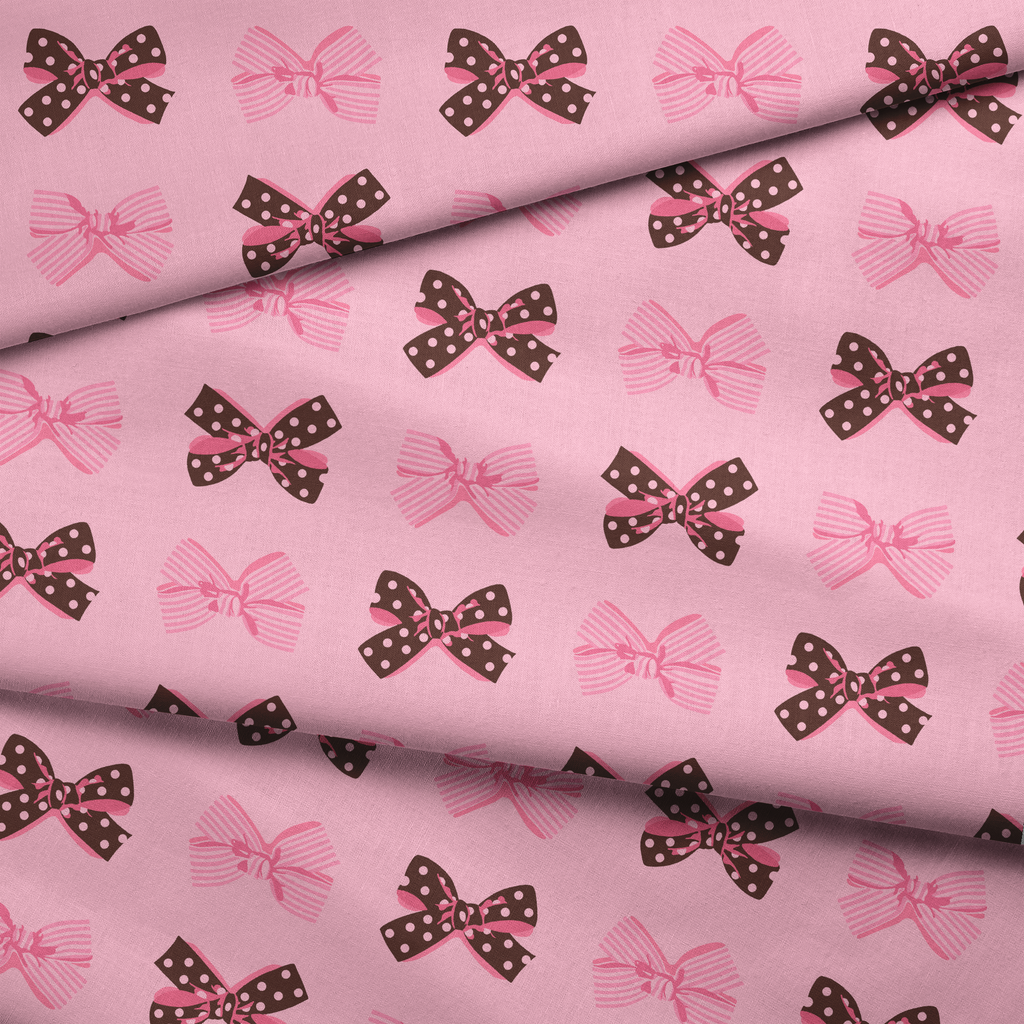Classic polka dot and striped bows in brown and pink against a sweet pink background. Perfect for craft, apparel, and quilt projects.