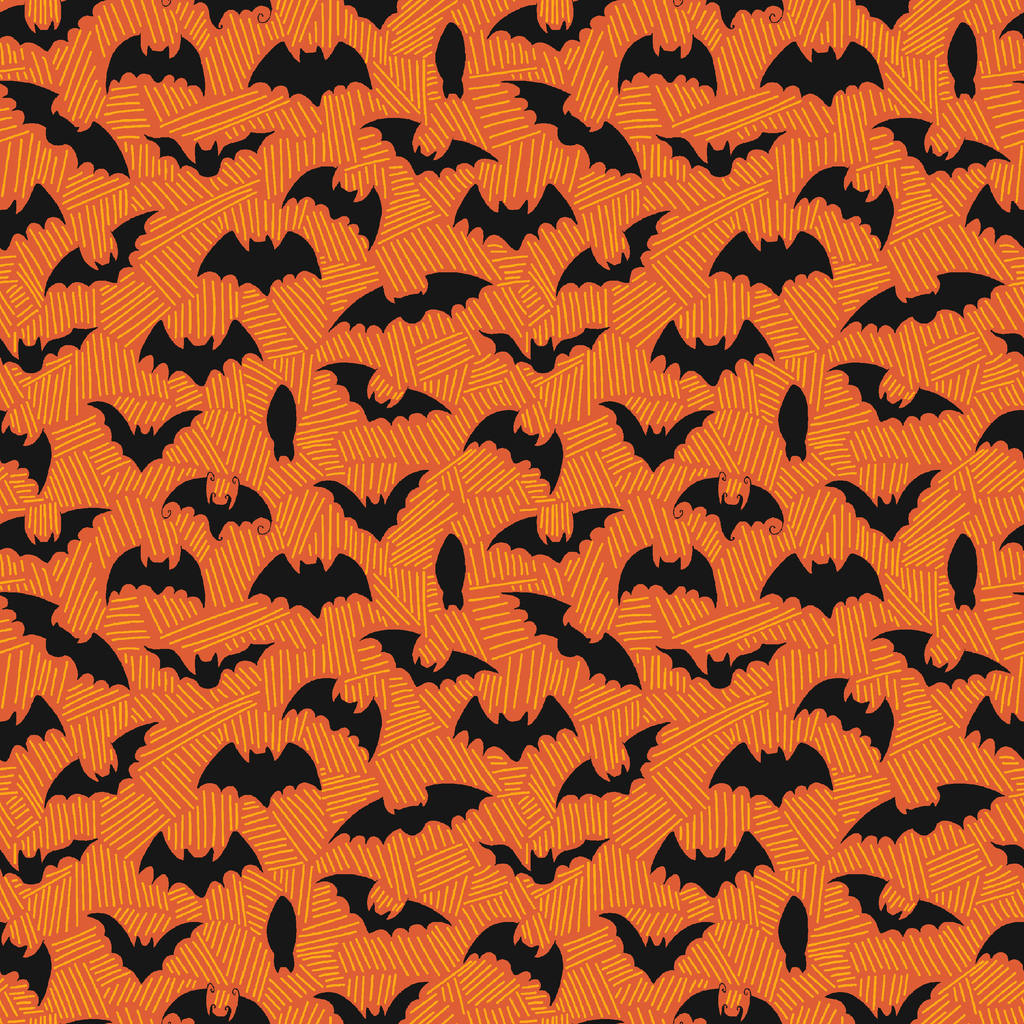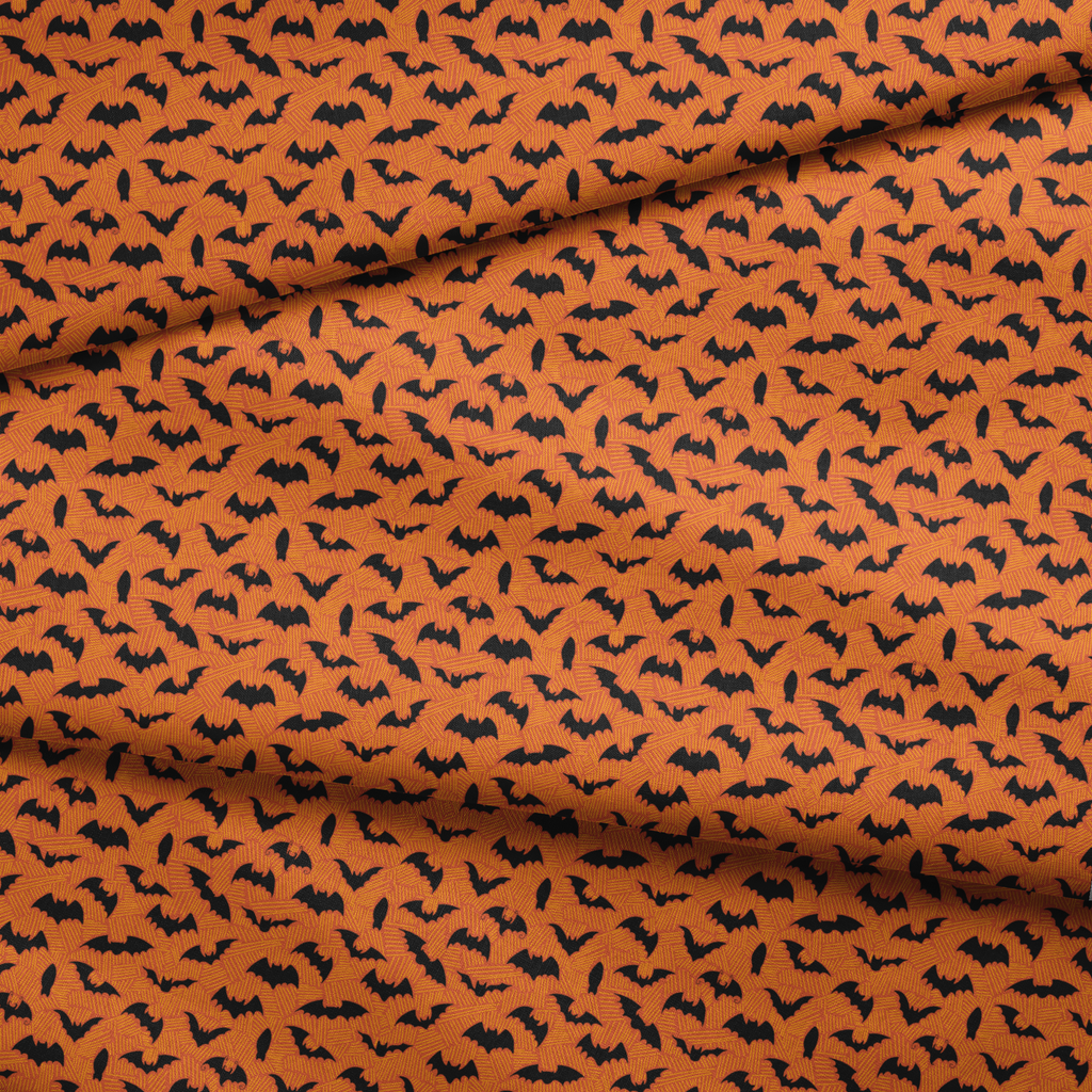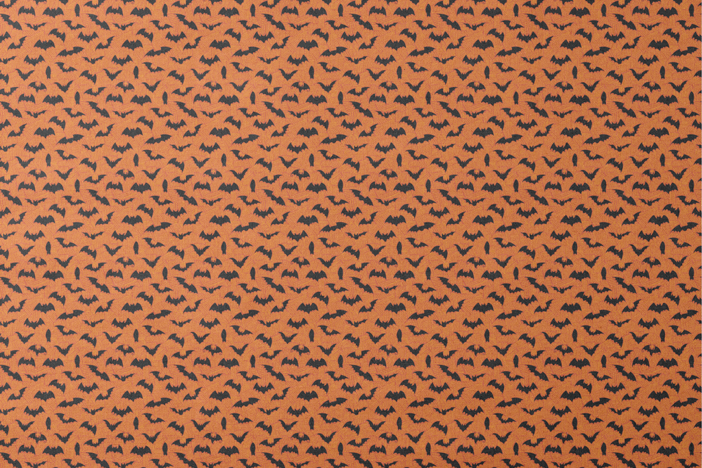 Bats in flight create a spooky Halloween pattern on an orange background, perfect for gothic autumn decorating and holiday celebrations.