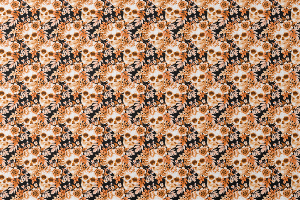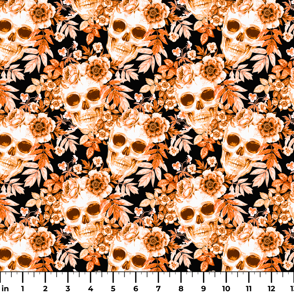 Dramatic sepia-toned skulls intertwine with delicate florals and fern-like foliage against a deep black backdrop, creating a hauntingly beautiful contrast between mortality and nature's blooms. The copper and cream color palette gives this gothic design a vintage feel while maintaining an edgy appeal. Perfect for statement Halloween decor, unique accent pillows, or an eye-catching lining in a custom jacket that showcases your bold style sensibilities.