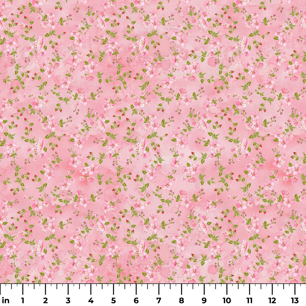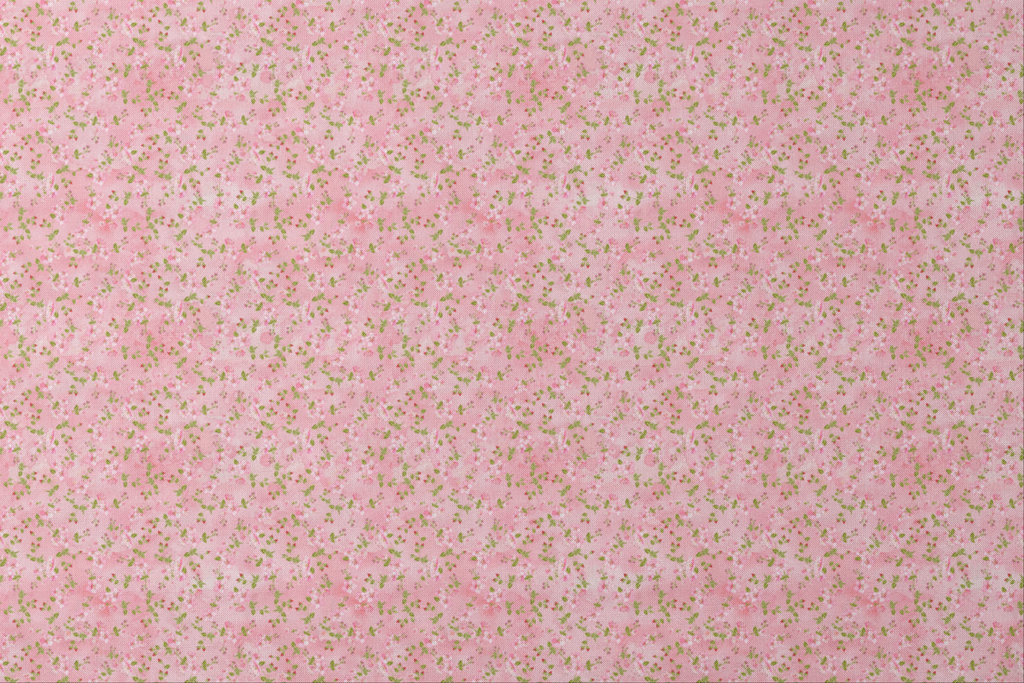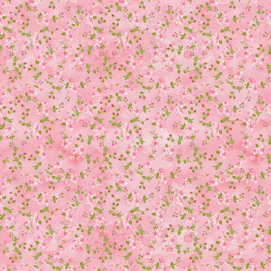 Delicate cherry blossoms dance across a dreamy rose-pink background, creating a sweet springtime atmosphere. The scattered white and pink blooms with their fresh green leaves have a hand-painted quality that adds charm and dimension to the design. This feminine floral would make a gorgeous lining for a handmade jewelry box or a perfectly sweet fabric for a little girl's Easter dress.