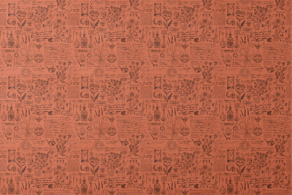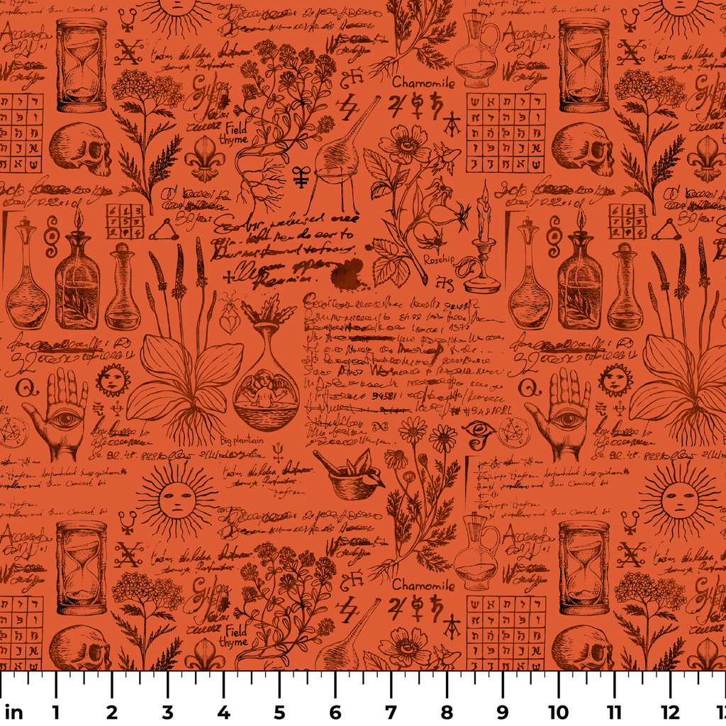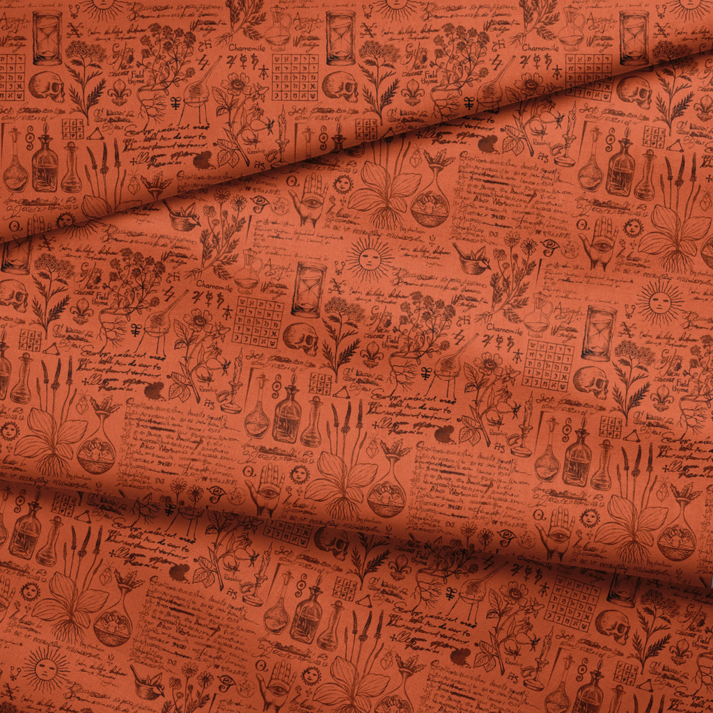 Vintage botanical fabric featuring scientific sketches of plants, laboratory equipment, and handwritten notes on an orange background, perfect for a mystical home decor project.