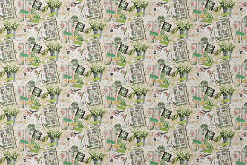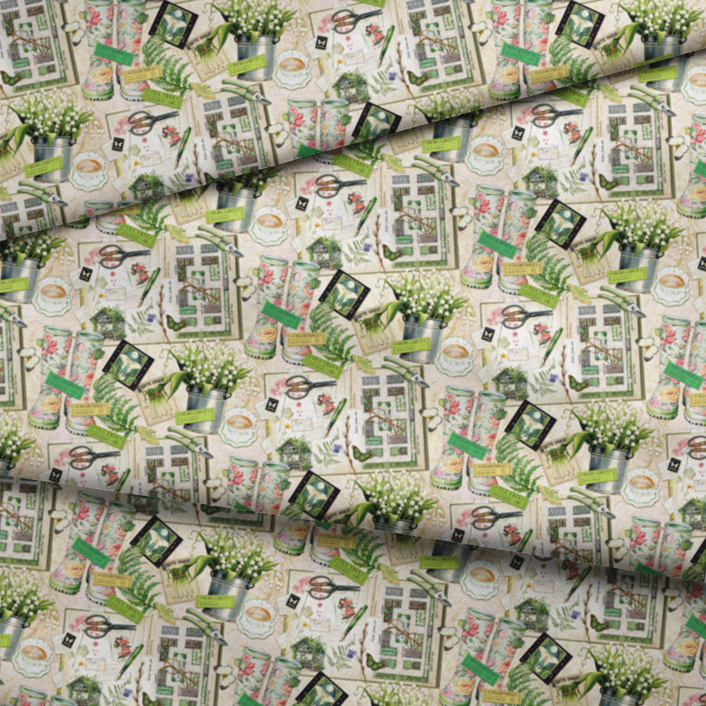 This enchanting botanical collage features a gardener's dream arrangement of herbs and florals on a creamy beige background. Vintage-inspired illustrations of garden plans, floral-patterned boots, aromatic herb labels like Eucalyptus and Chamomile, and delicate lily of the valley blooms in metal buckets create a sophisticated gardener's workspace. Perfect for crafting botanical-themed bags, pillows, or garden room accessories that bring the peaceful charm of a potting shed indoors.