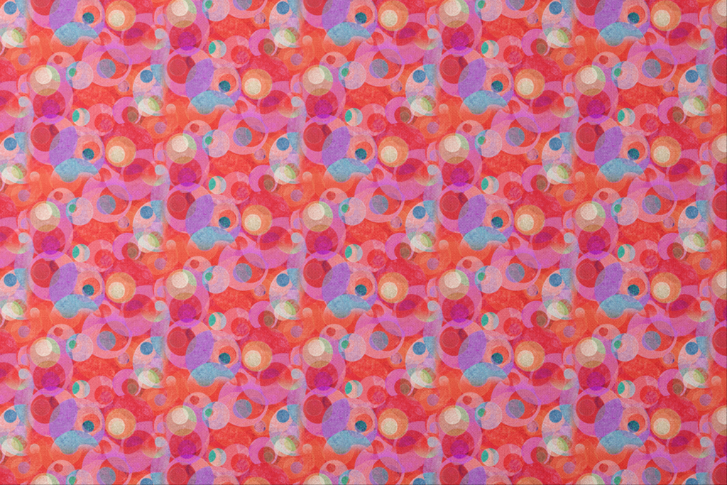 Dancing circles overlap in a vibrant watercolor wash of fuchsia, coral, and scarlet, punctuated with cool blue, violet, and subtle green accents. The translucent bubbles create a sense of depth and movement, with each circle catching light like stained glass. This bold, energetic pattern would make a stunning statement piece for a modern quilting project or bring life to summer tote bags and accessories.