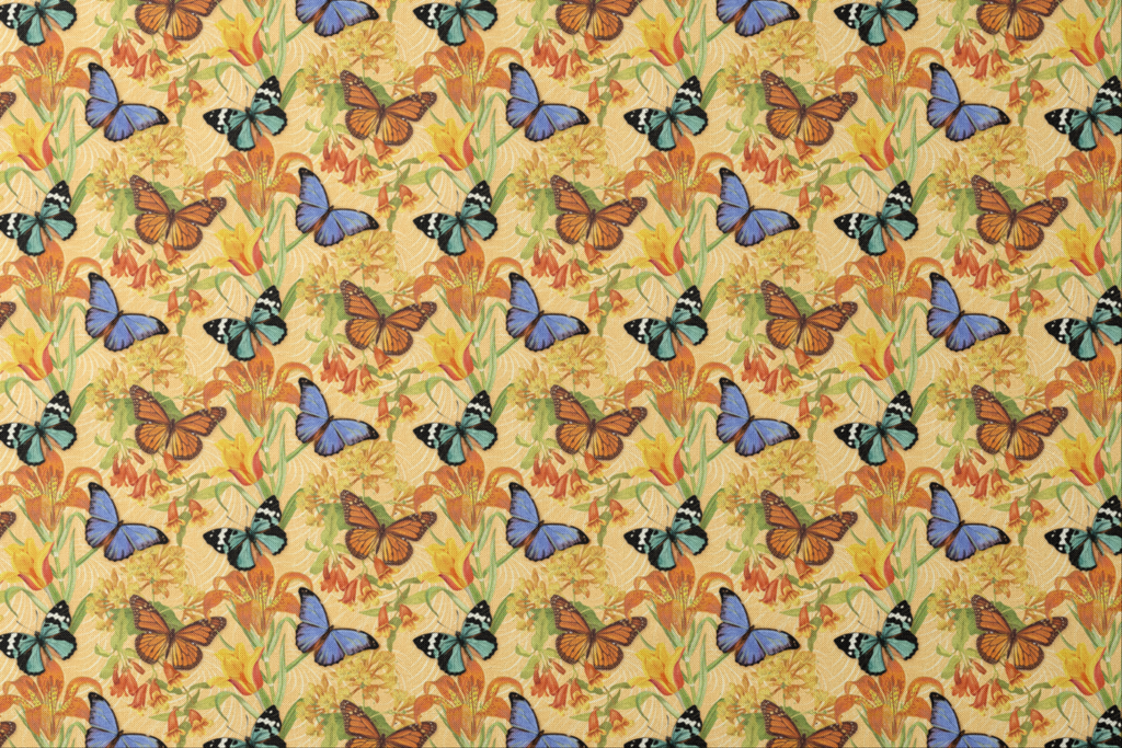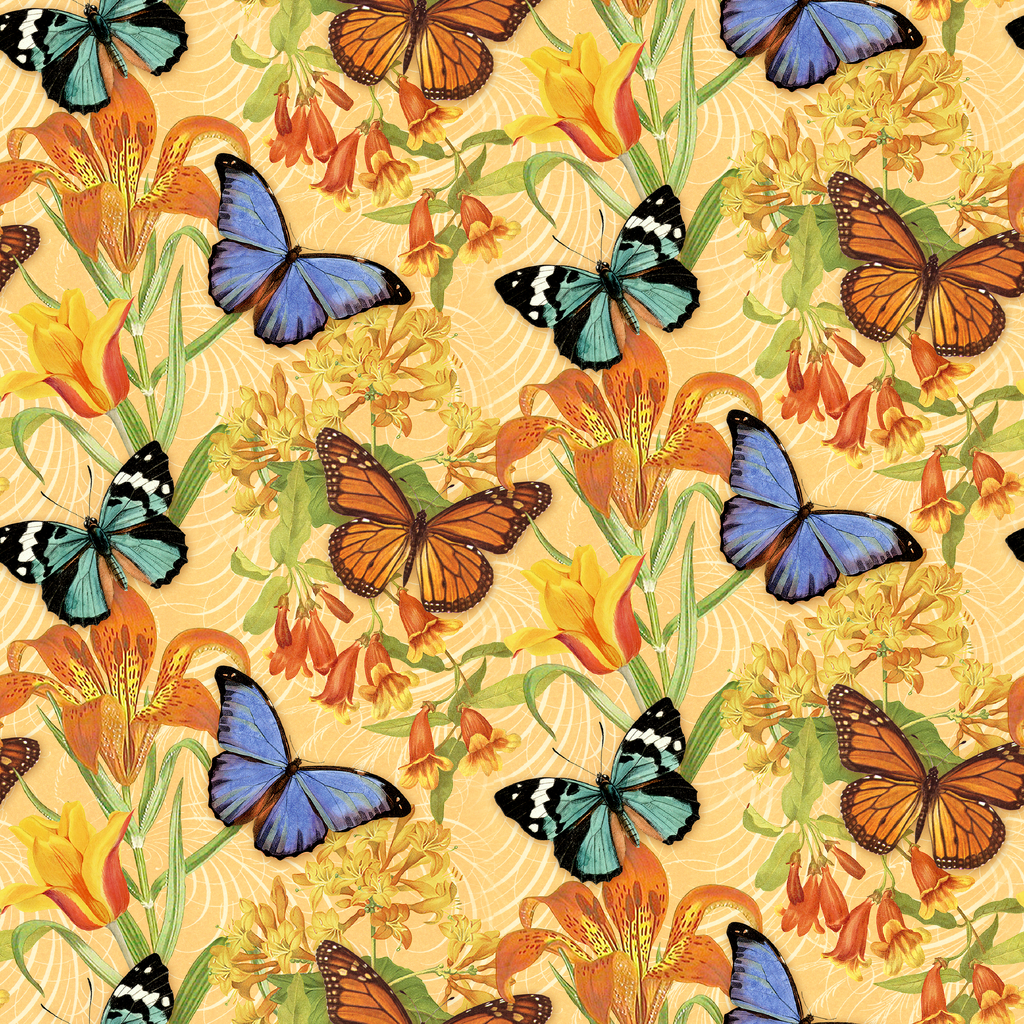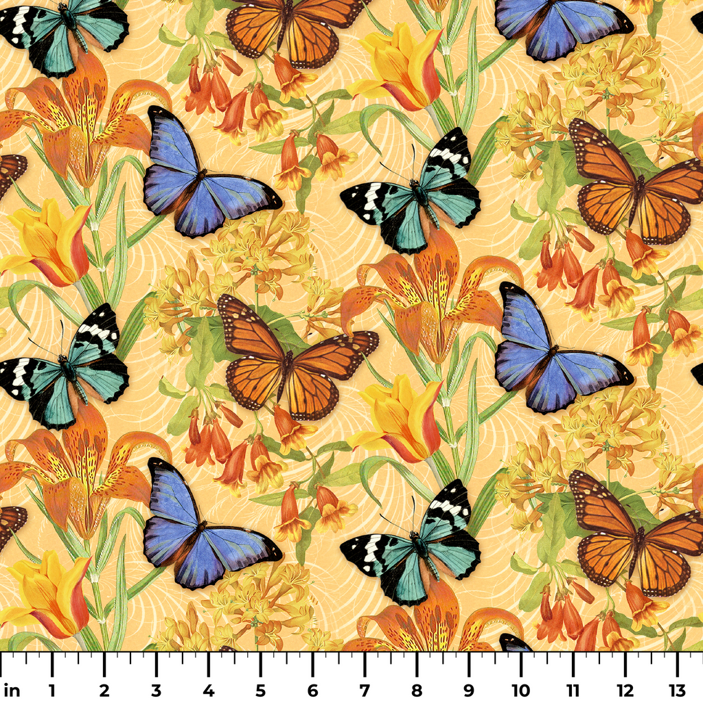 Vibrant butterflies flutter among rich golden lilies and delicate bell-shaped blooms on this enchanting fabric. Majestic monarchs in burnt orange contrast beautifully with striking blue morpho butterflies and mint-green patterned wings, all set against a warm cream background with subtle swirling details. This eye-catching botanical print would make gorgeous accent pillows or a stunning quilted wall hanging for your sunroom or garden-inspired space.