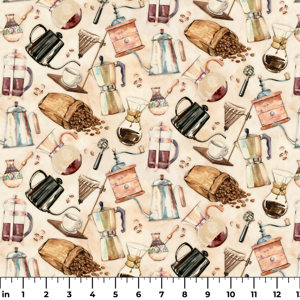 Vintage coffee theme fabric featuring hand-drawn coffee pots, grinders, coffee beans, and cups in a charming retro style with muted browns and beige tones. Perfect for kitchen decor or cafe-inspired projects.