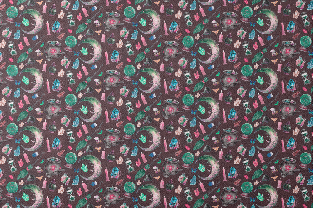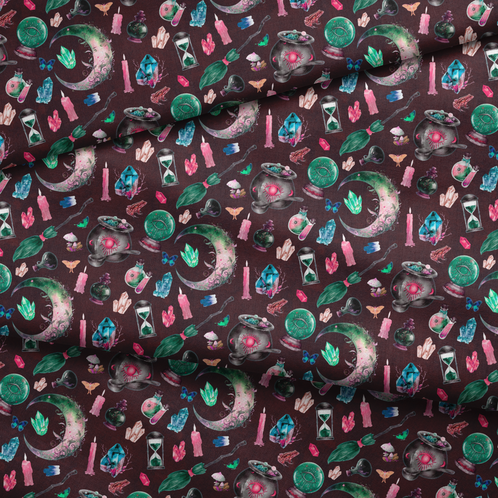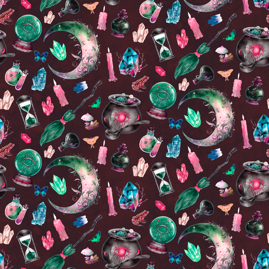 Mystical witchcraft pattern featuring crescent moons, crystal gems, hourglass timers, and potion bottles on a burgundy background. Ideal for eclectic home and wall decor projects.