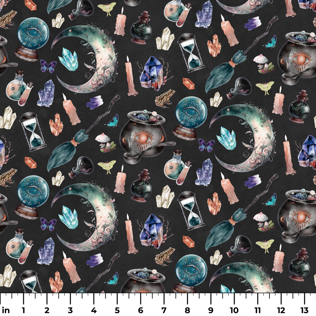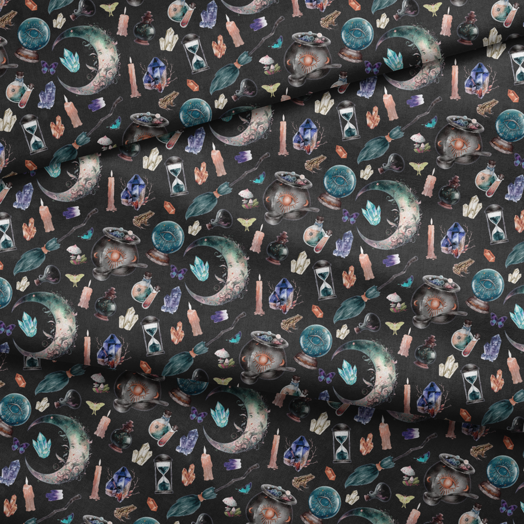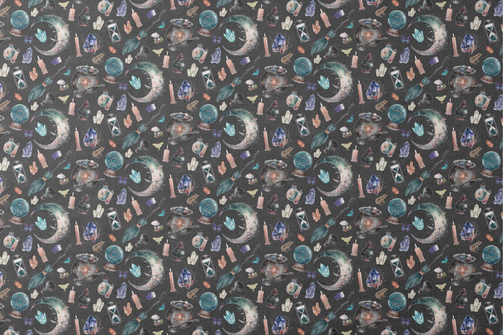 Mystical witchcraft pattern featuring crescent moons, crystal gems, hourglass timers, and potion bottles on a dark grey background. Ideal for eclectic home and wall decor projects.