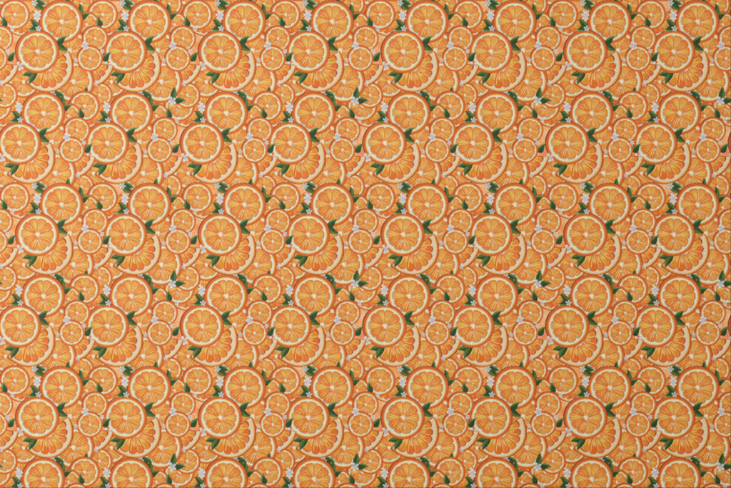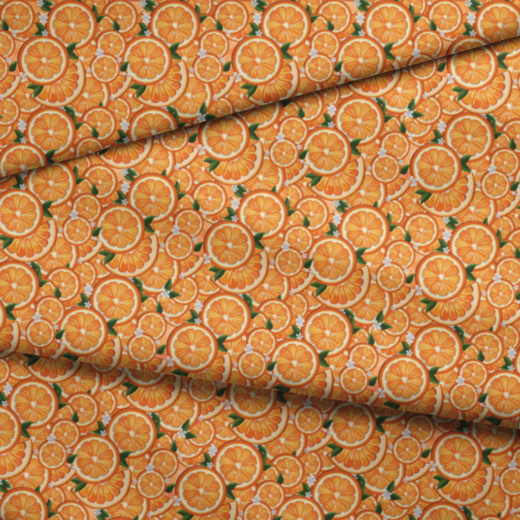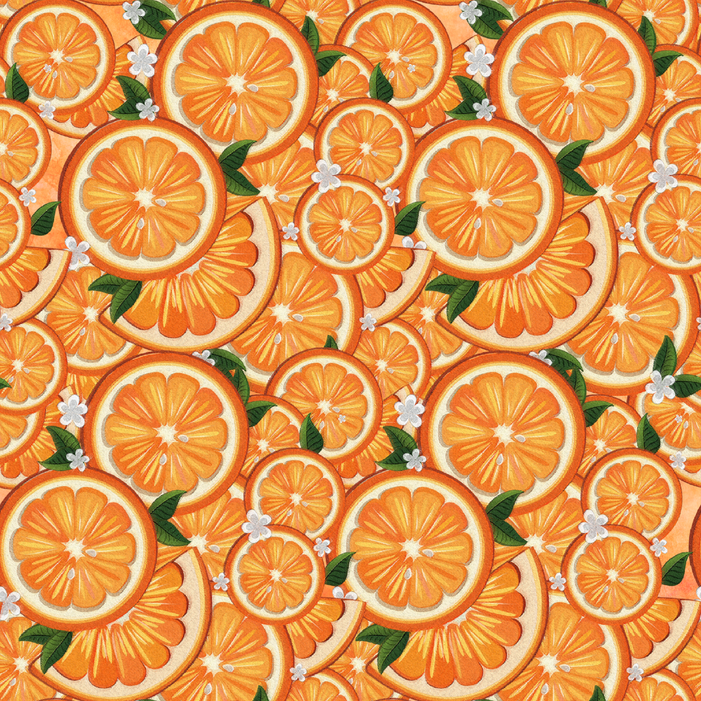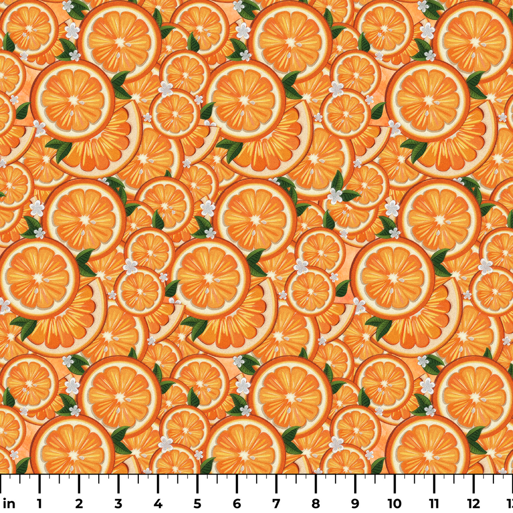 Bursting with juicy citrus slices, this vibrant fabric showcases a tightly packed array of orange rounds in sunny golden-orange hues. Crisp green leaves and delicate white blossoms peek through the citrusy collage, adding fresh contrast to the zesty design. Perfect for kitchen accessories like aprons and tea towels, this cheerful pattern would also make delightful summer napkins or a refreshing accent for a sunroom pillow.