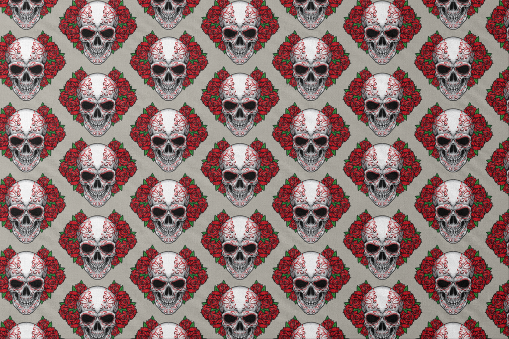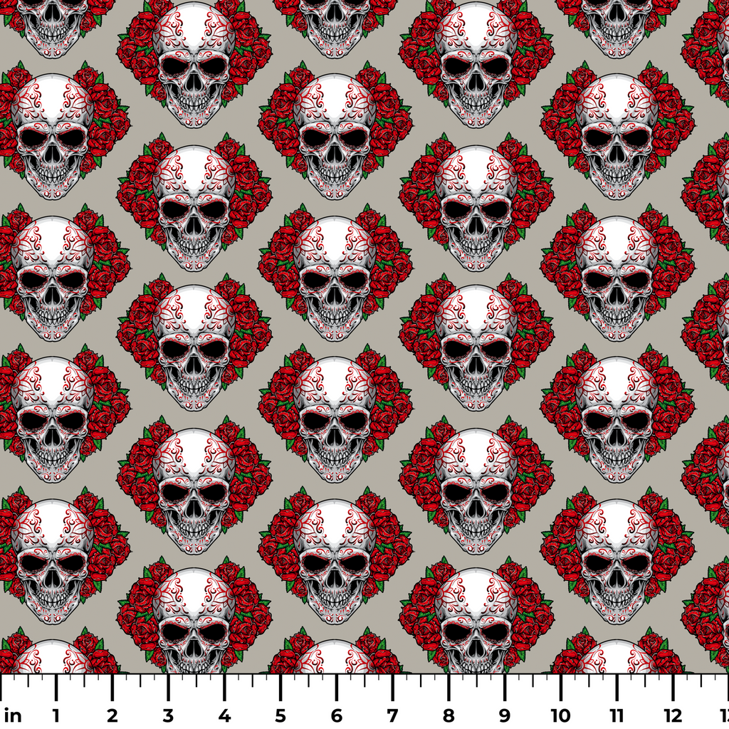Bold sugar skulls adorned with crimson roses create a dramatic pattern against a soft gray background. Each skull features intricate red swirls and decorative elements, surrounded by lush, vibrant roses with rich green leaves. Perfect for striking Halloween projects, Day of the Dead celebrations, or statement garments that showcase your unique style.
