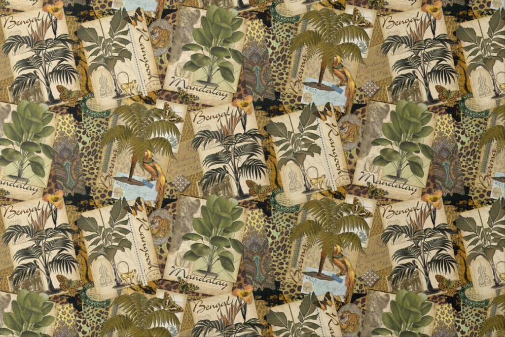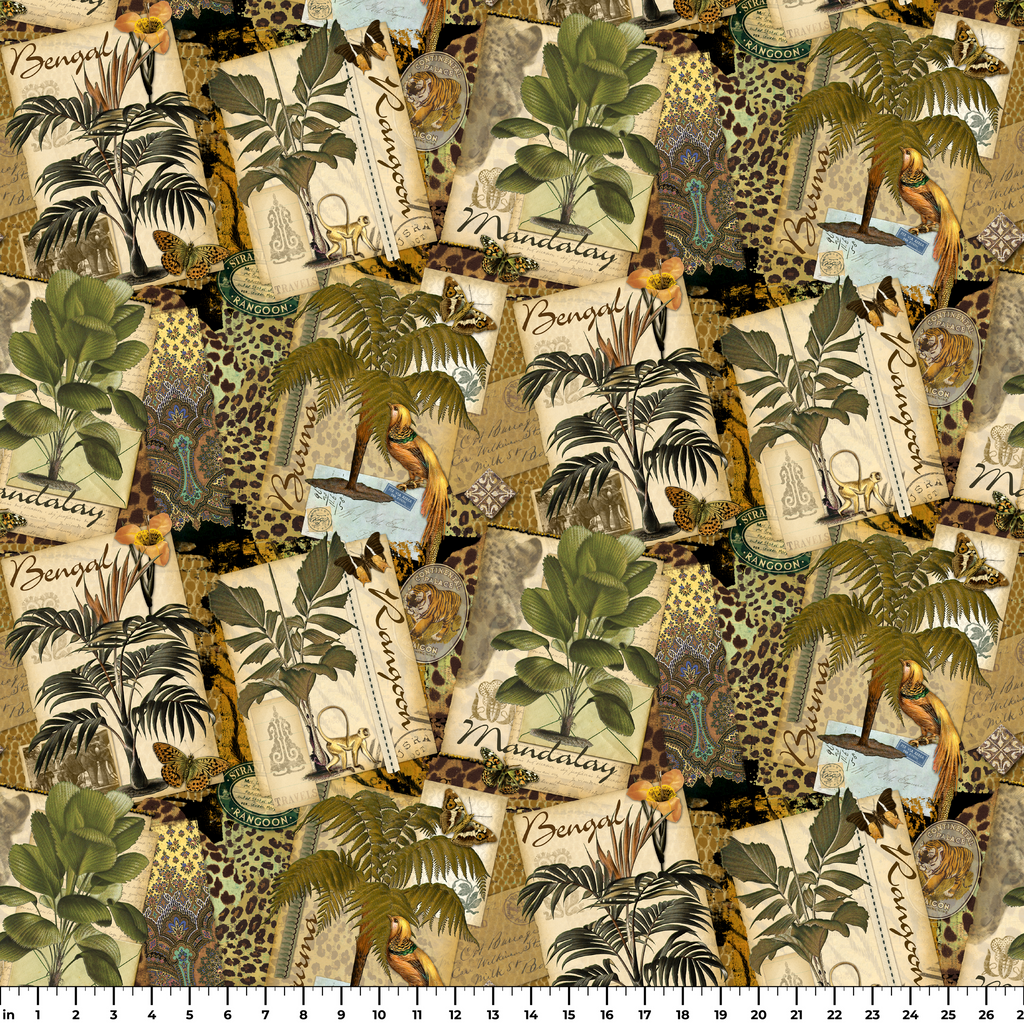 Transport yourself to exotic lands with this rich vintage-inspired collage featuring lush botanical illustrations set against aged parchment backgrounds. Tropical palms, exotic birds, and leopard print accents mingle with postmarks and travel ephemera from far-flung locales like Bengal, Rangoon, and Mandalay in a sophisticated earth-toned palette of olive greens, tans, and burnished golds. This striking fabric would make stunning accent pillows for a global-inspired living space or an eye-catching lining for a handcrafted journal cover.