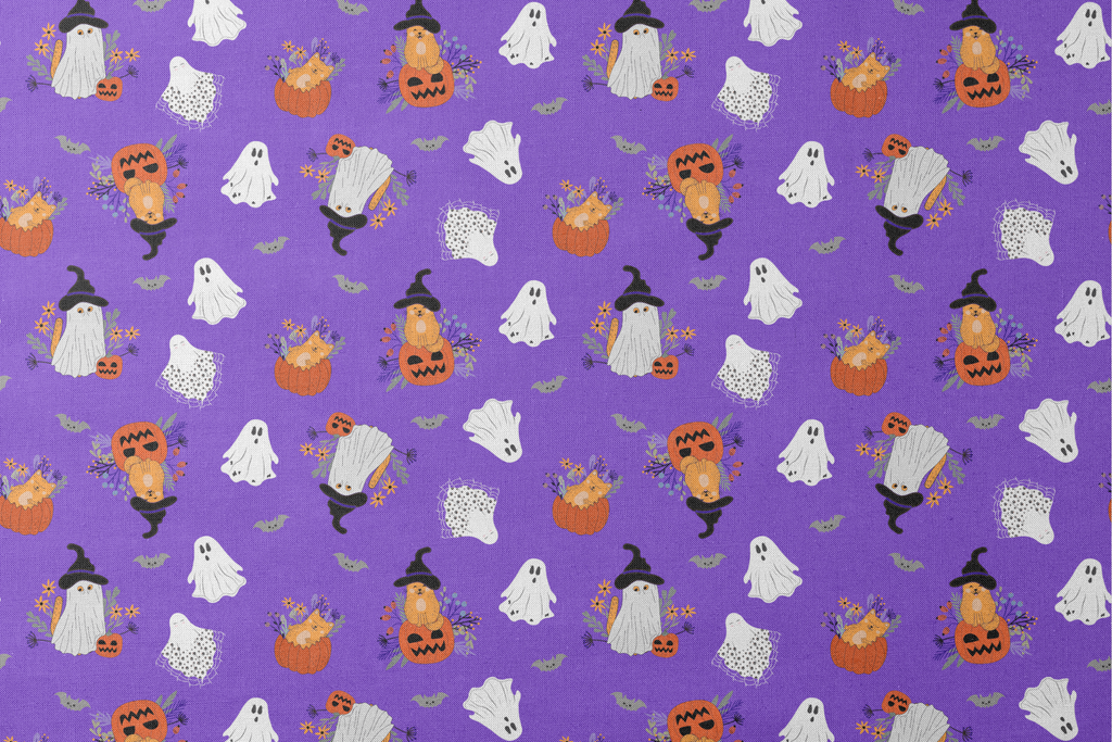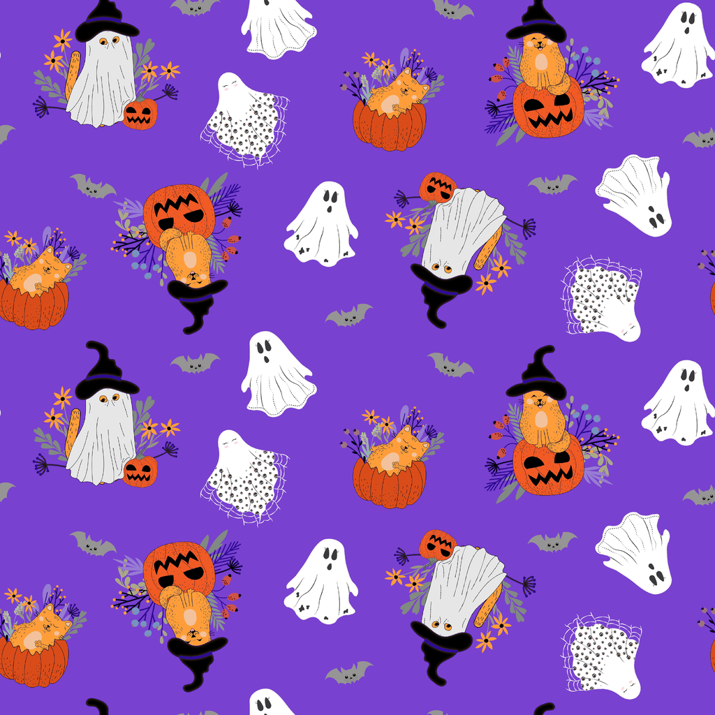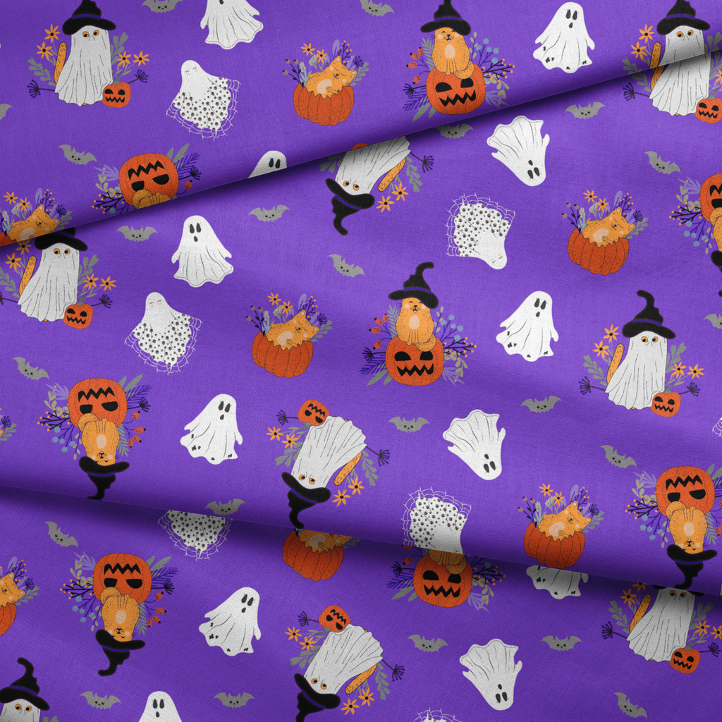 Festive Halloween pattern featuring whimsical ghosts, jack-o'-lantern pumpkins, and spooky cats on a vibrant purple background with grey bats, perfect for spooky season decor or apparel.