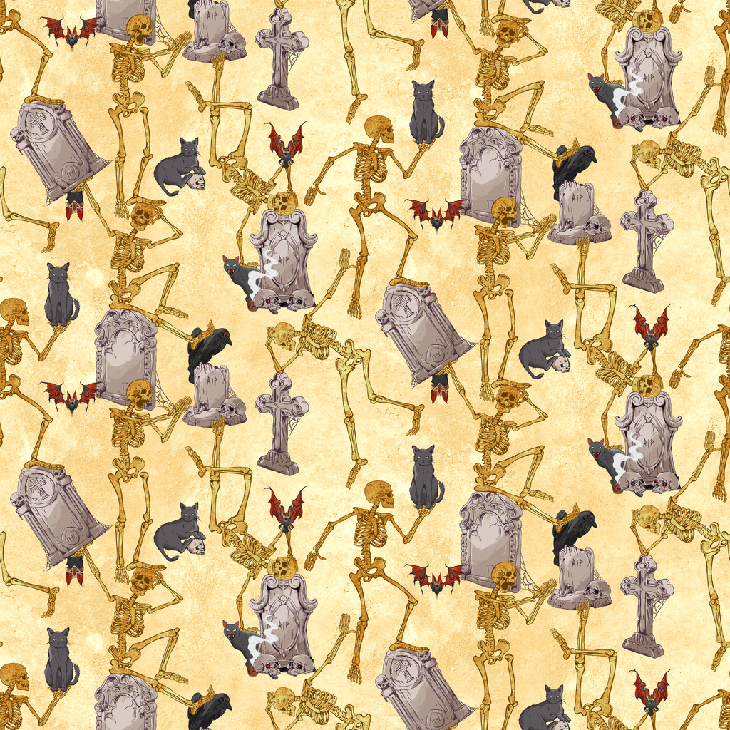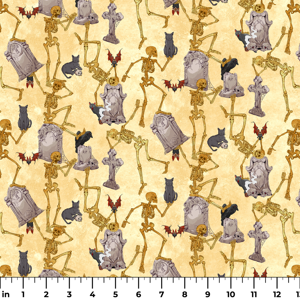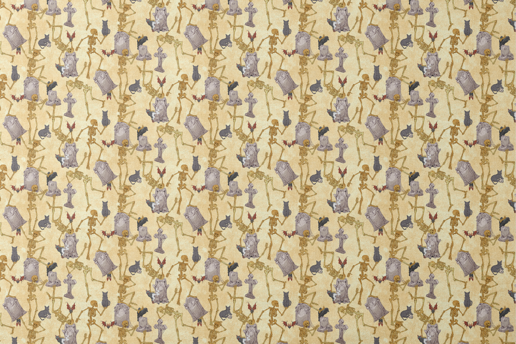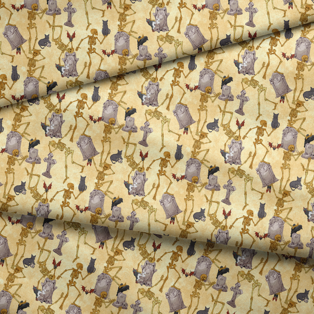 Spooky Halloween fabric featuring dancing skeletons, gray tombstones, and cats on a cream background. Perfect for haunting holiday decorations and gothic crafts.