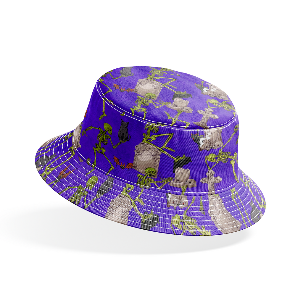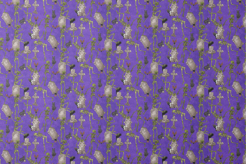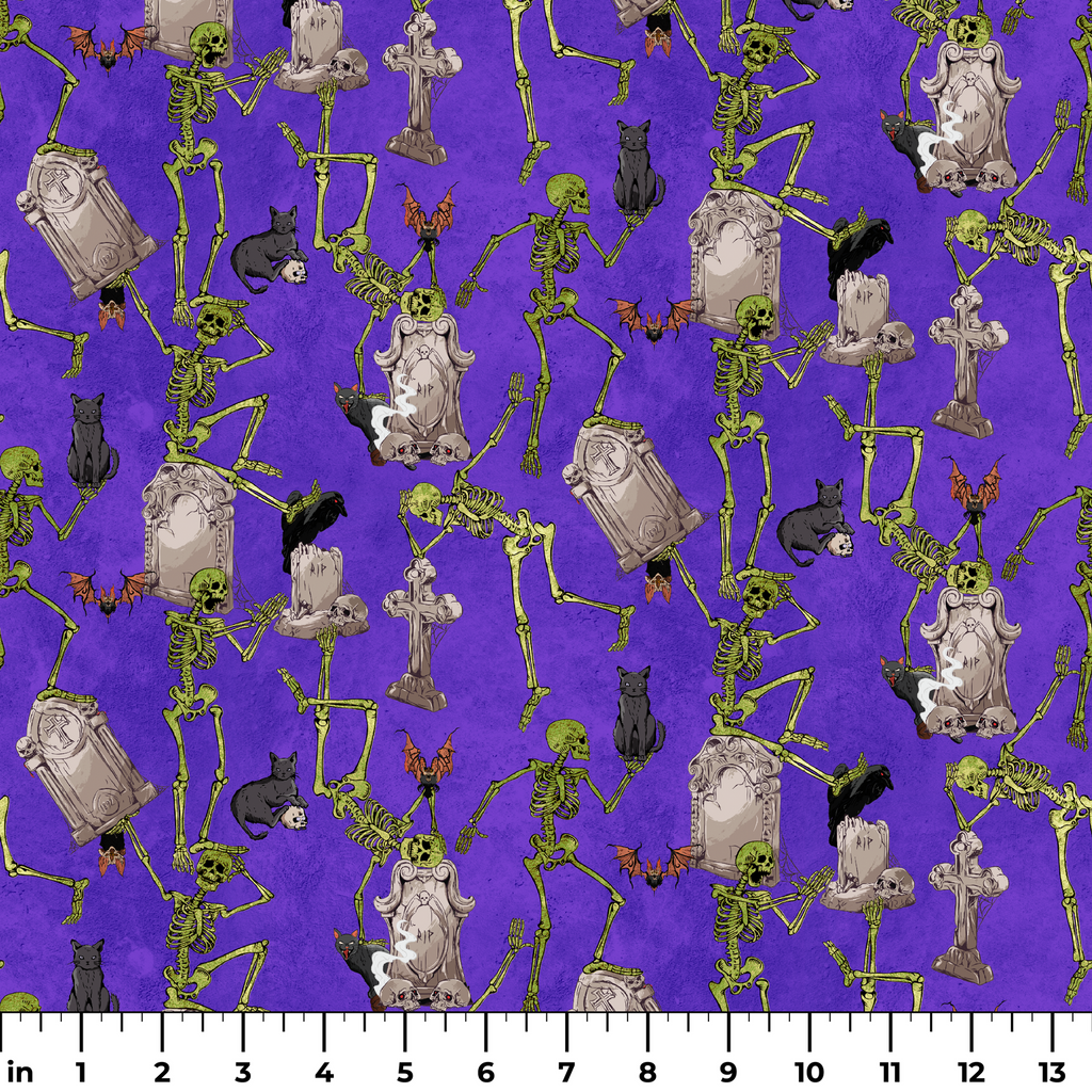 Spooky Halloween fabric featuring dancing skeletons, gray tombstones, and cats on a vibrant purple background. Perfect for haunting holiday decorations and gothic crafts.
