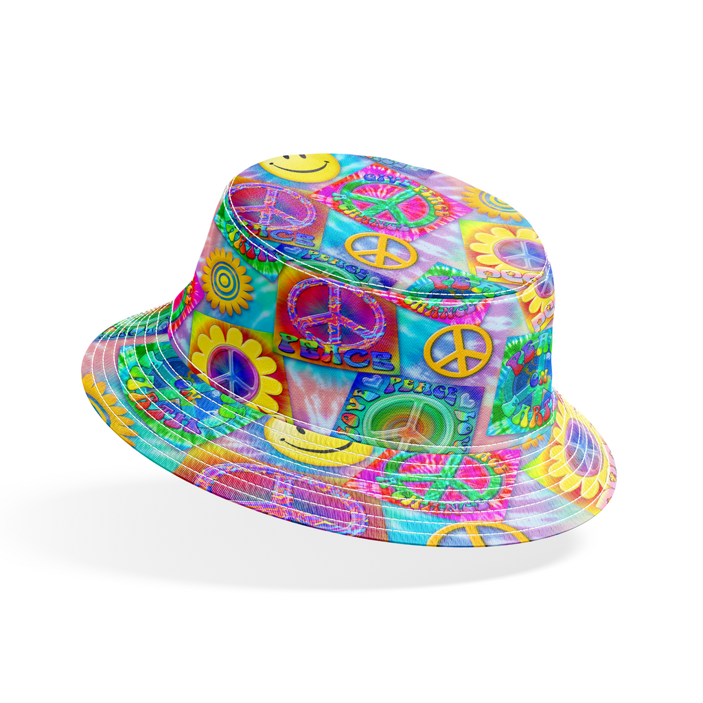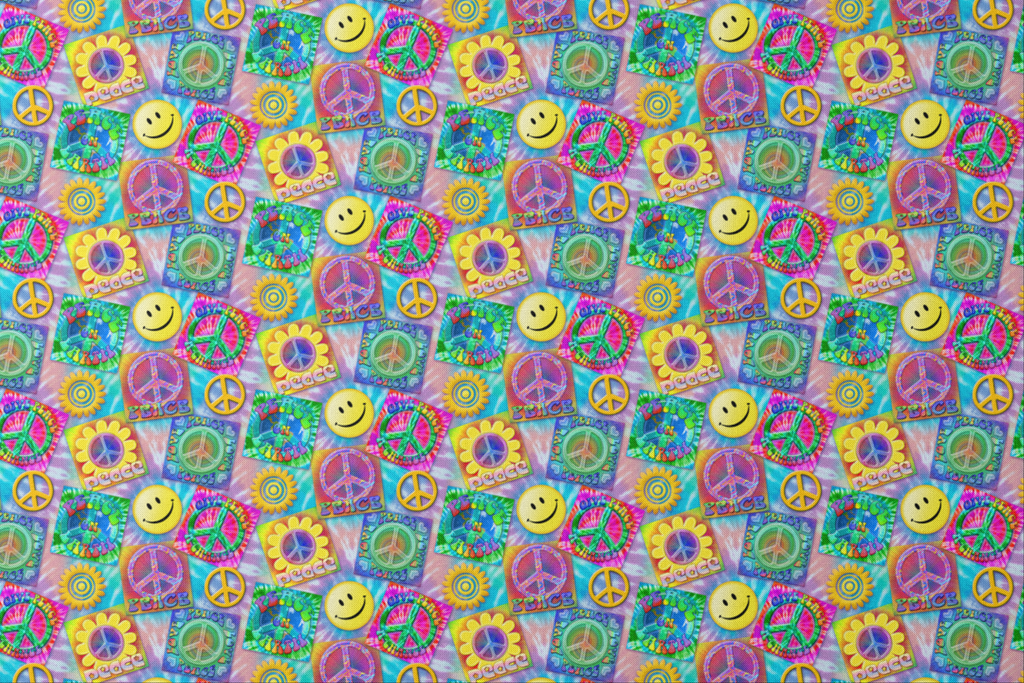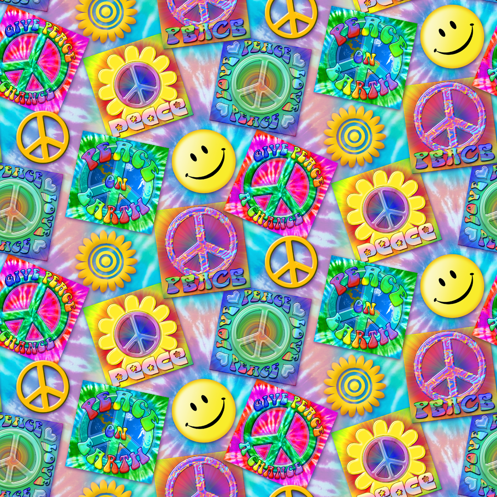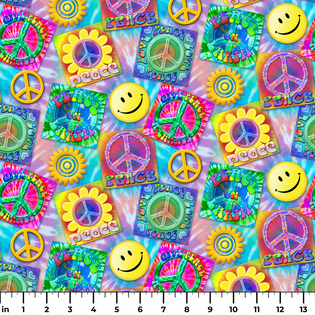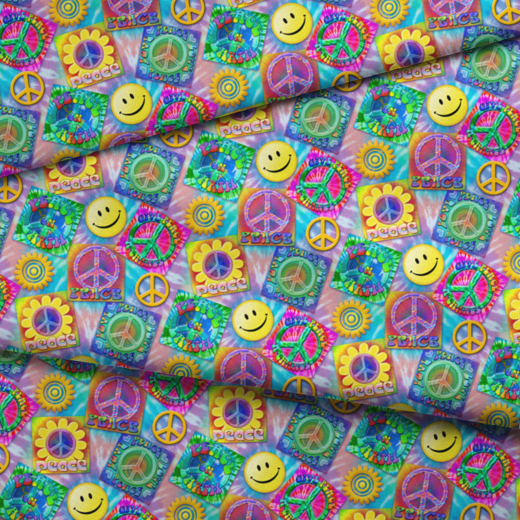 This vibrant, psychedelic fabric bursts with retro peace symbols, smiling faces, and tie-dye inspired squares against a soft tie-dyed background. Electric hues of purple, blue, green, and yellow create a nostalgic 70's vibe, with playful peace signs nestled in sunflowers and colorful squares declaring "Peace," "Peace on Earth," and "Give Peace a Chance." Perfect for creating festival gear, eye-catching cushion covers, or funky tote bags that make a bold statement.