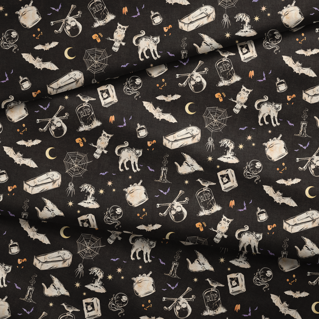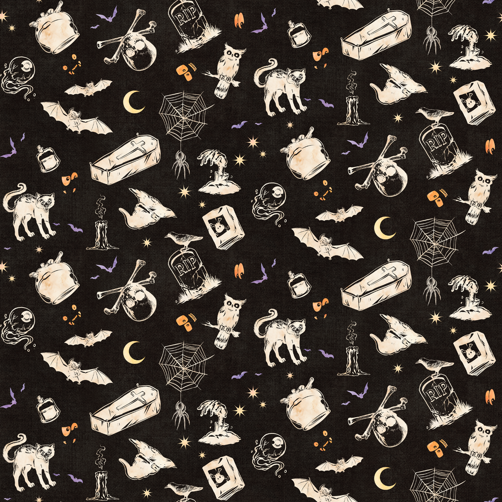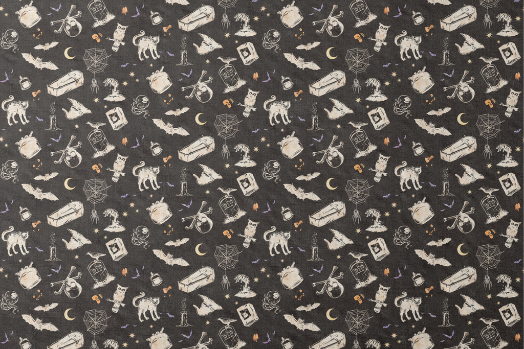 Spooky gothic pattern featuring coffins, bats, cats, pentagrams, and skeletal designs on a black background – perfect for Halloween decor or gothic apparel.