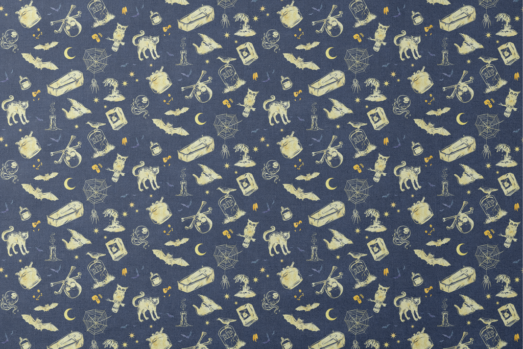 Spooky gothic pattern featuring coffins, bats, cats, pentagrams, and skeletal designs on a blue background – perfect for Halloween decor or gothic apparel.