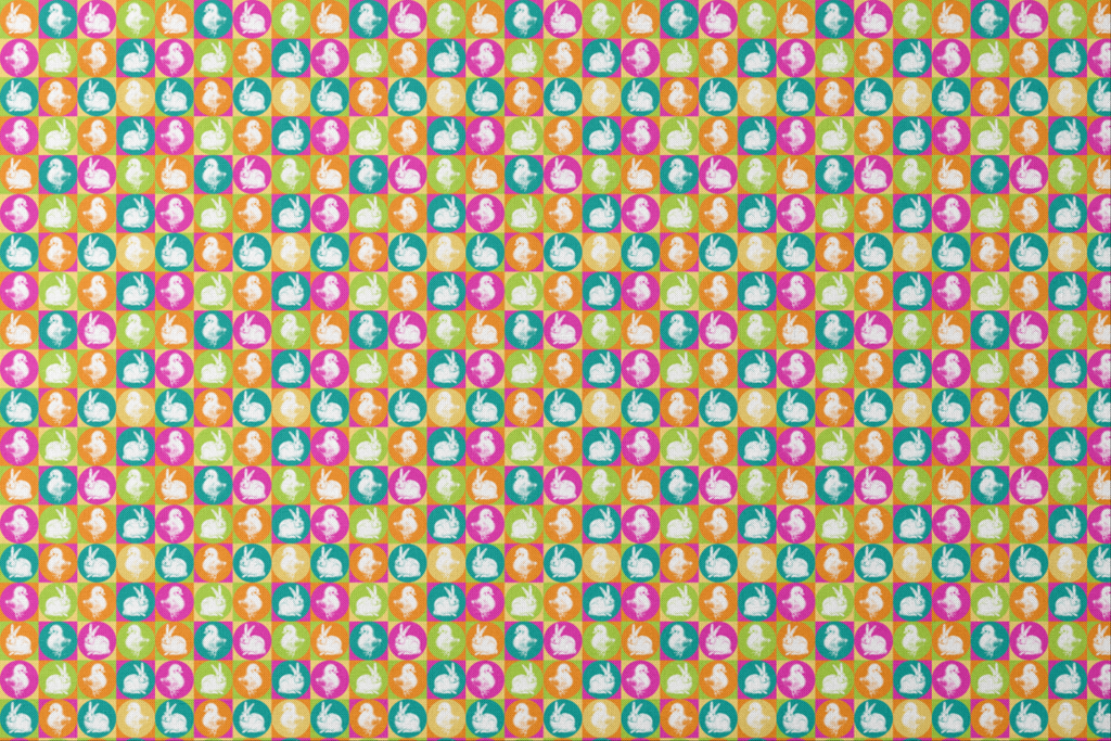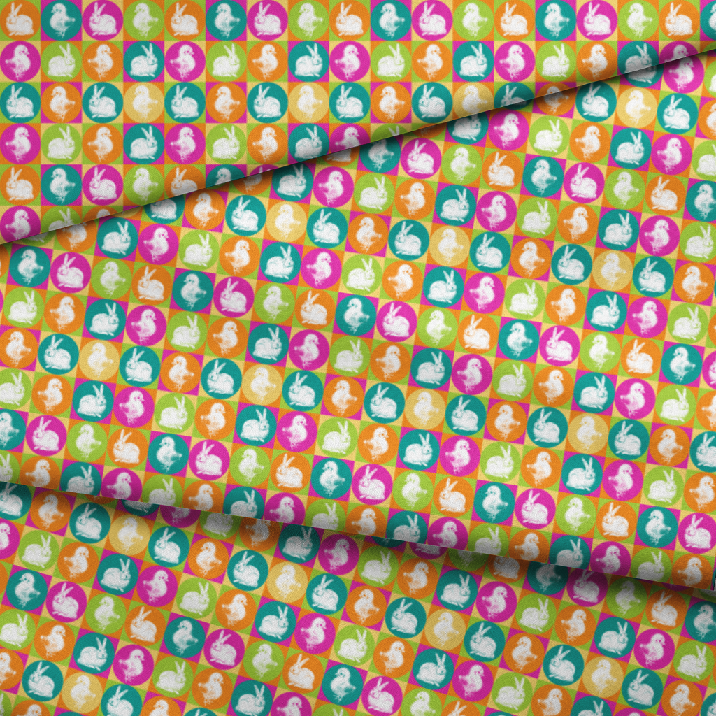 Adorable silhouetted bunnies and chicks come to life in this vibrant patchwork design featuring circles of spring-bright colors. White sketch-style illustrations of fluffy rabbits and baby chickens pop against bold backgrounds of magenta, teal, orange, lime green, and sunny yellow. This cheerful fabric captures the essence of Easter and springtime celebrations, perfect for children's clothing, seasonal table runners, or festive basket liners.