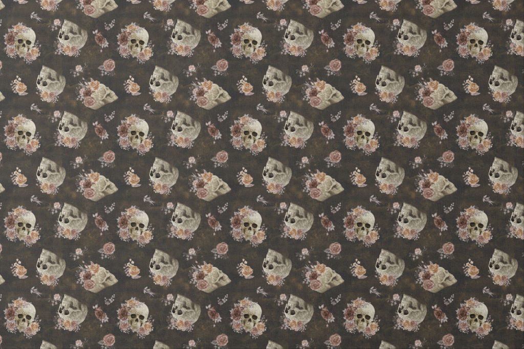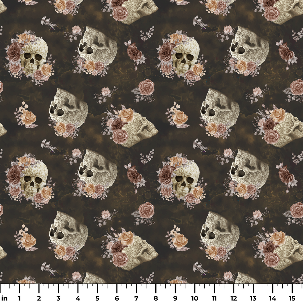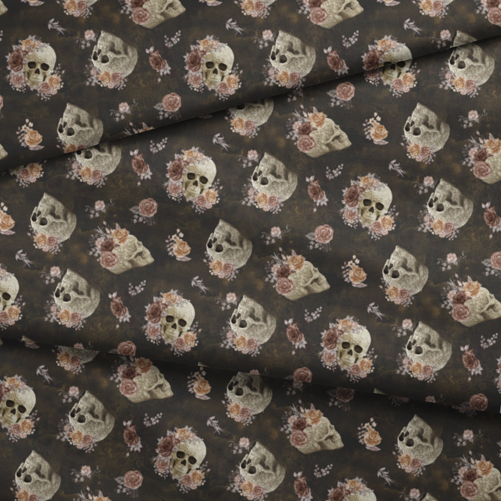 Hauntingly beautiful skulls adorned with delicate roses in dusty blush and cream float against a rich, smoky charcoal background. Intricate carved details on the bone-colored skulls contrast with the softness of the vintage-inspired florals, creating a captivating balance between macabre and romantic elements. This striking fabric would make a stunning statement piece for Halloween decor projects or edgy fashion accessories like handbags and jackets.
