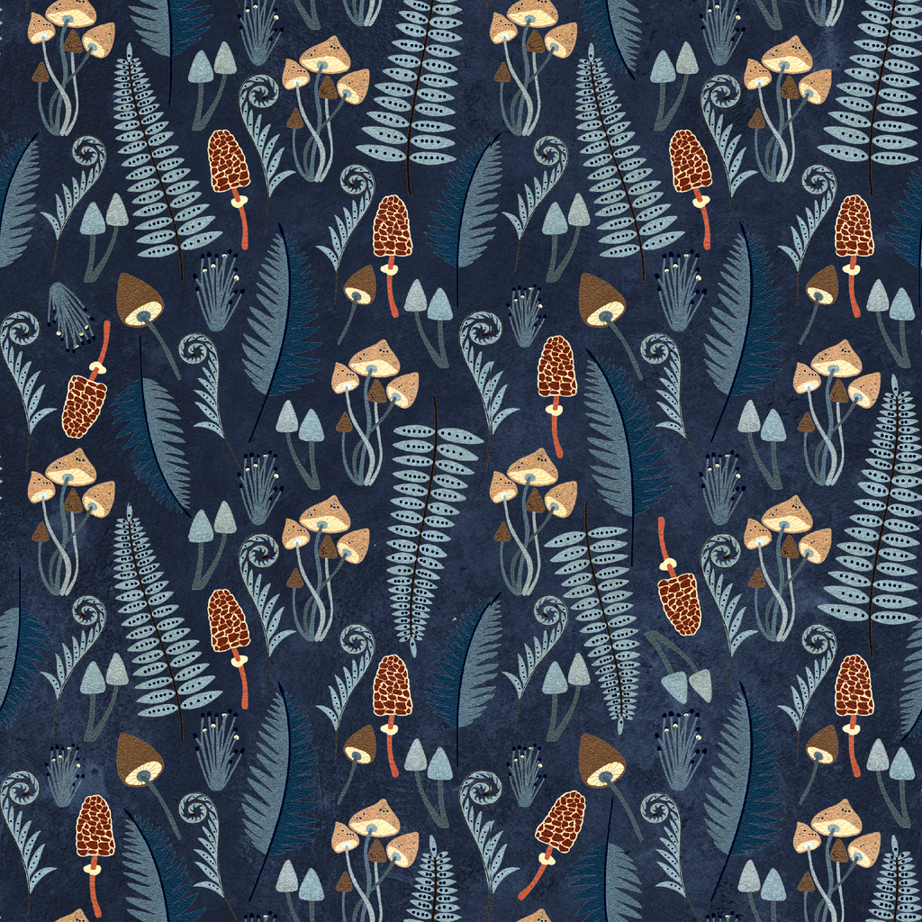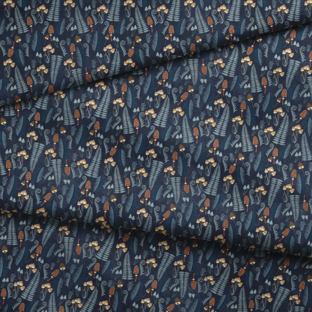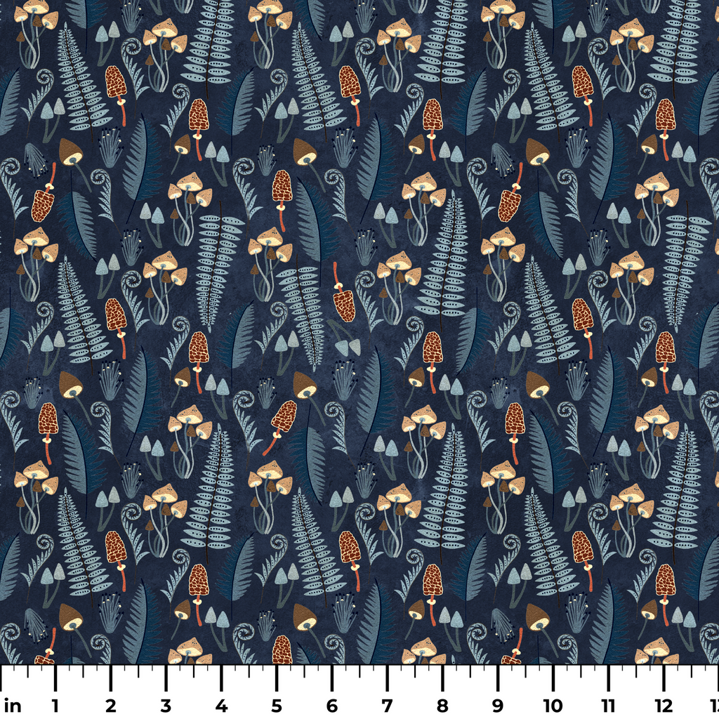Step into an enchanted forest with this moody navy blue fabric adorned with whimsical mushrooms and ferns. Golden-capped toadstools, honeycomb-textured morels, and delicate silver-blue fungi create a magical woodland scene against the deep indigo background. The hand-drawn quality of the botanical elements gives this fabric a distinctly artisanal feel that would transform pillows or quilted wall hangings into conversation pieces. Perfect for nature lovers seeking to bring the mysterious charm of the forest floor into their handmade creations.