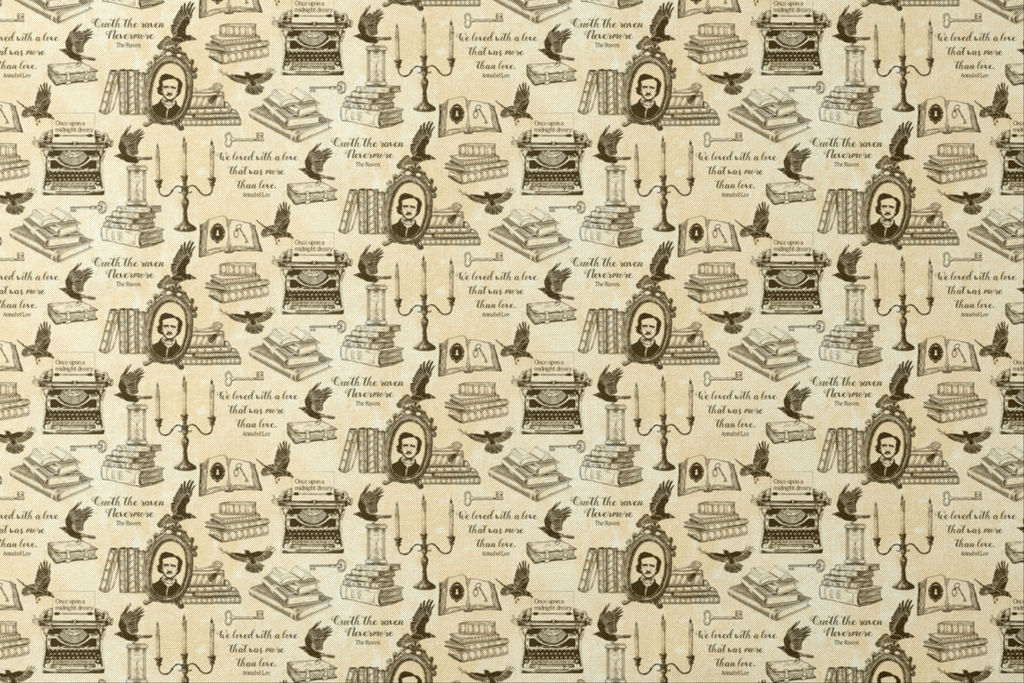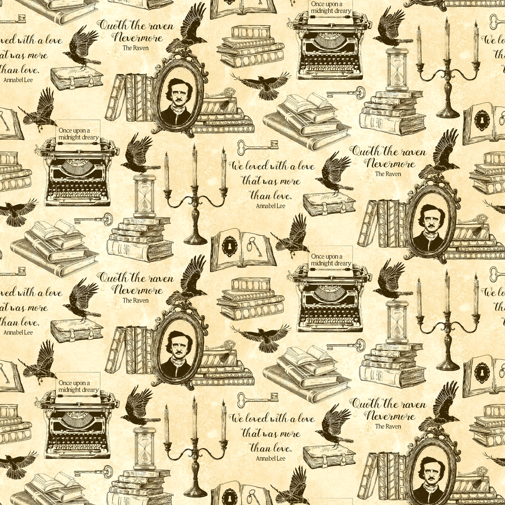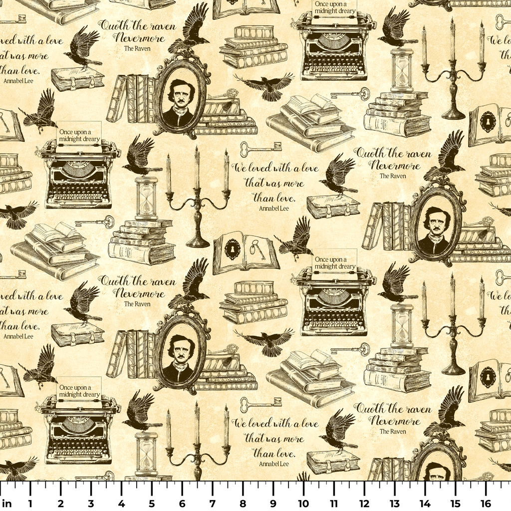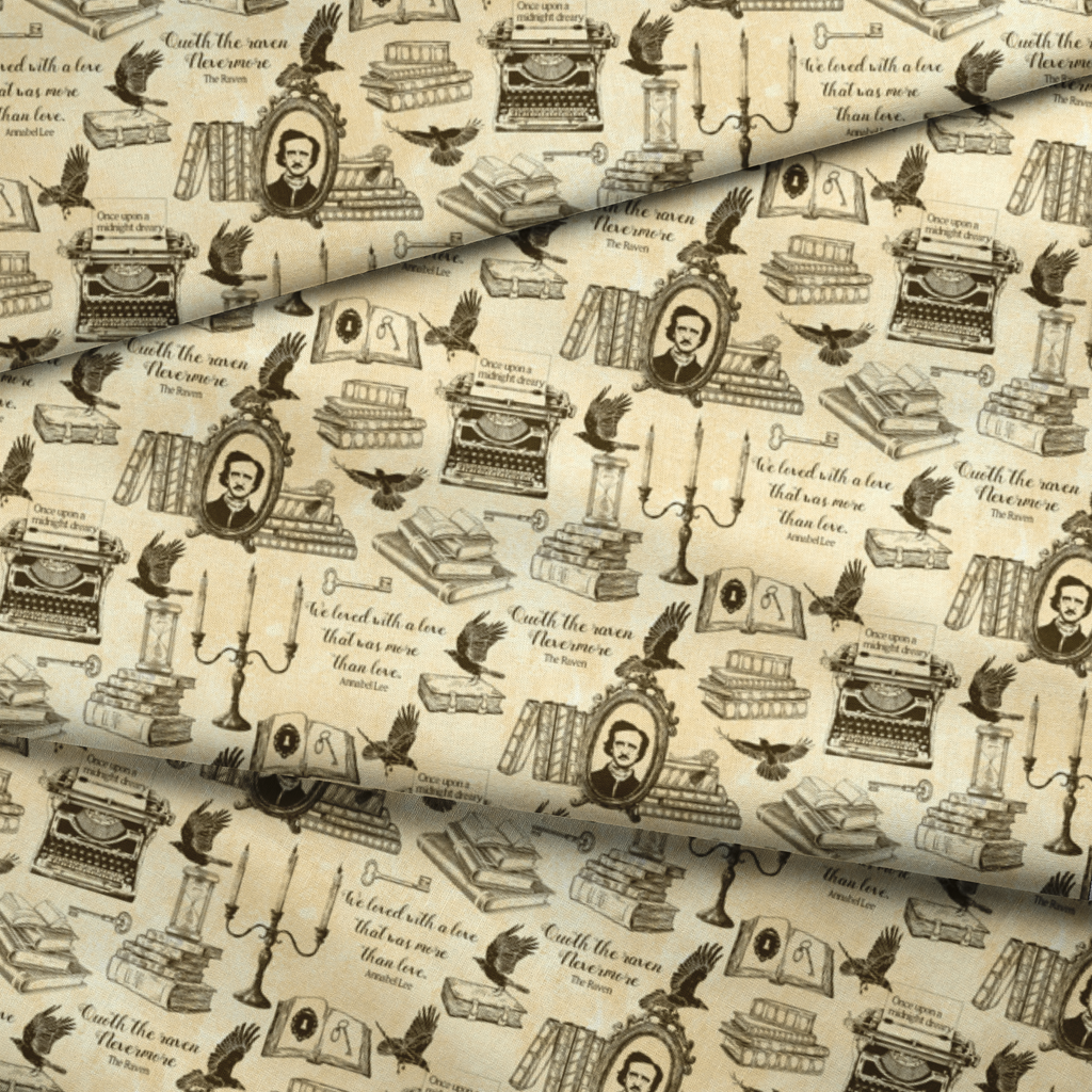 This hauntingly elegant fabric features iconic literary elements on a parchment-colored background with rich black ink illustrations. Vintage typewriters, soaring ravens, candlesticks, and stacks of books are interspersed with famous quotes from "The Raven" and references to "Annabel Lee," creating a moody tribute to classic literature. Perfect for book-themed crafts, library tote bags, or a dramatic accent pillow that will start conversations among fellow literature enthusiasts.