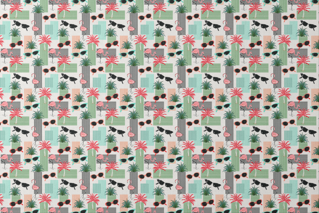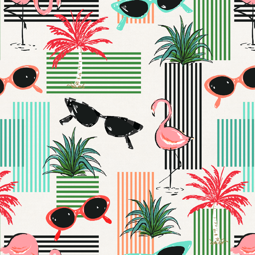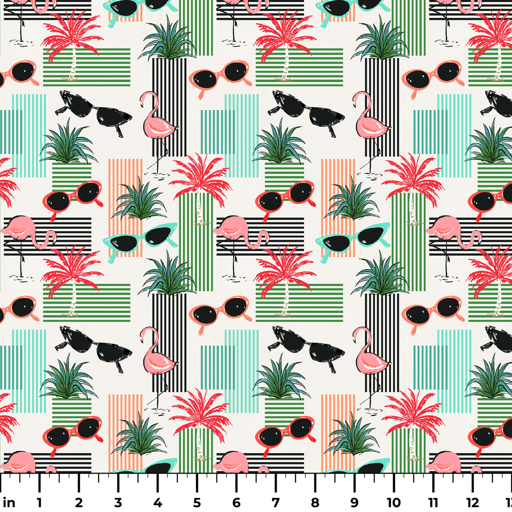 Transport yourself to a retro-tropical paradise with this playful print featuring pink flamingos, vibrant red palm trees, and stylish sunglasses against a backdrop of mint, coral, and black striped panels. The whimsical design balances midcentury modern flair with beach vacation vibes, creating a fabric that practically sings summer. Perfect for creating statement tote bags, cabana-inspired cushions, or quirky kitchen accessories that add a splash of personality to any space.