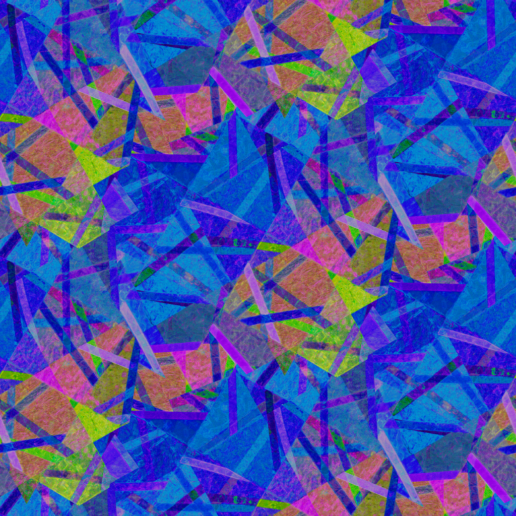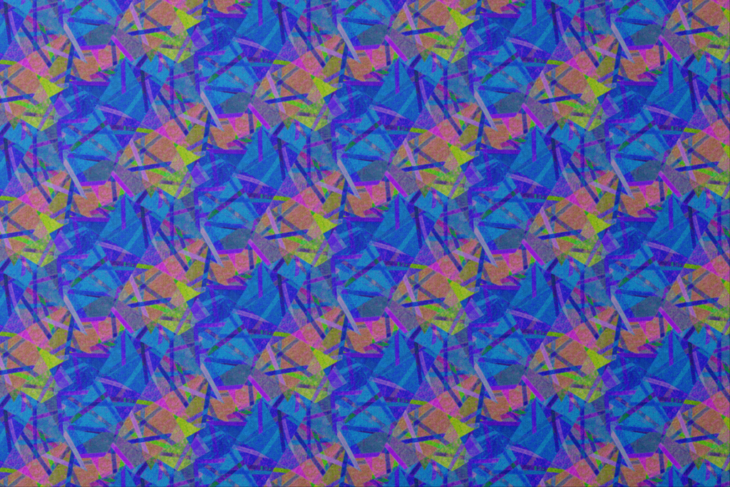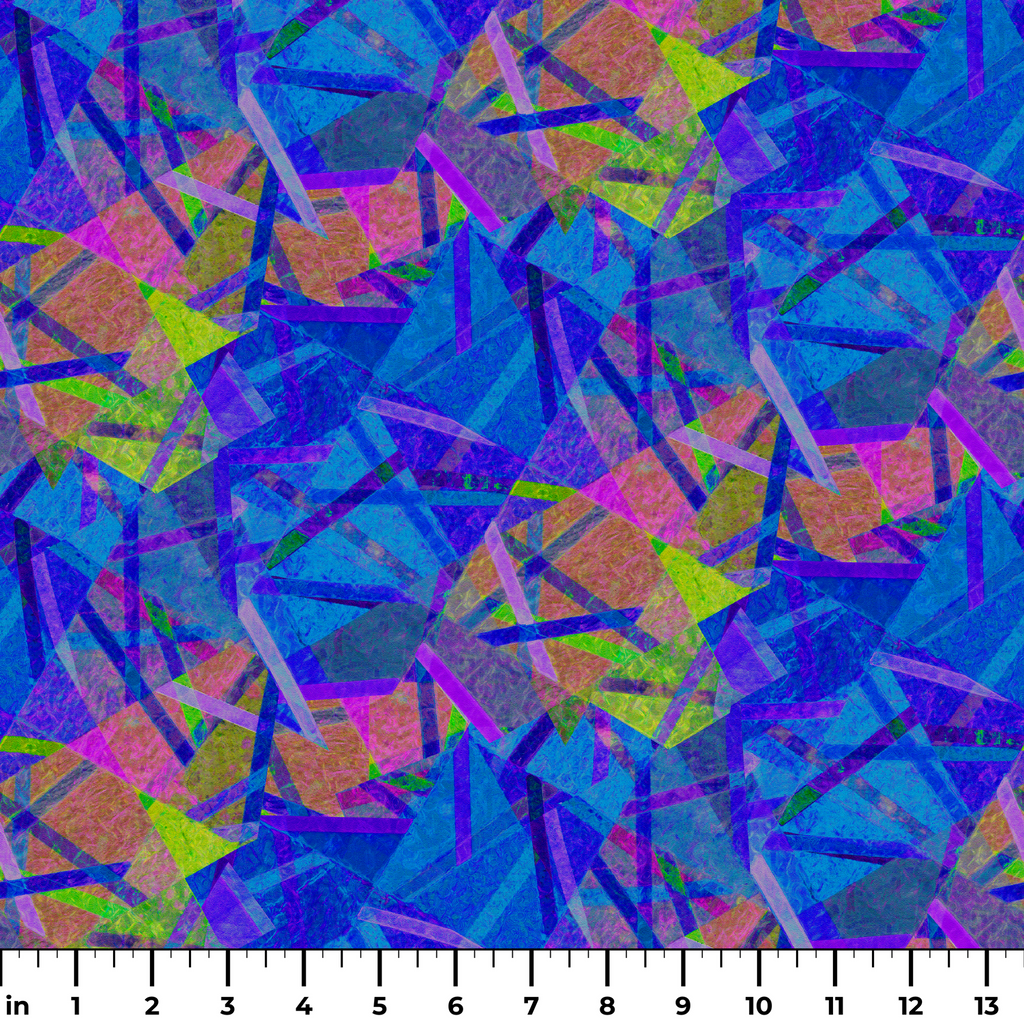 Vibrant shards of electric blue, deep purple, neon green, and coral pink collide in this stunning abstract geometric pattern. The translucent fragments overlap like fractured stained glass, creating depth and dimension with their jewel-tone brilliance. This eye-catching fabric would make a showstopping accent pillow or a dramatic lining for a special occasion jacket or handbag.