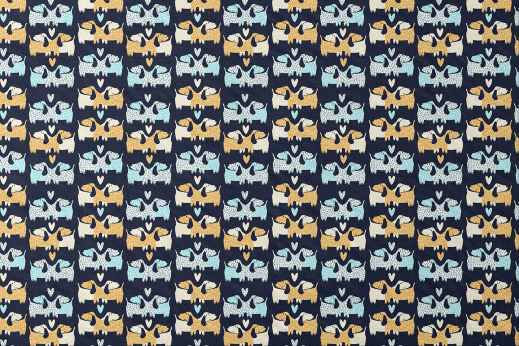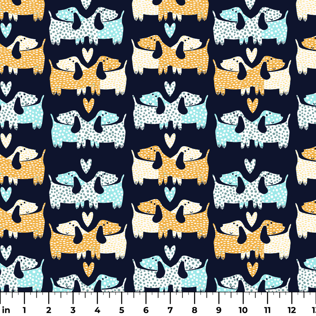 Adorable spotted dachshunds parade across a deep navy background in this whimsical fabric design. The playful pups appear in mustard yellow, soft mint, and gray-dotted patterns, each sporting a sweet smile and tiny heart accents. This charming cotton print would make the perfect statement in nursery projects or pet-themed quilts, and would bring a touch of fun to tote bags for dog lovers.