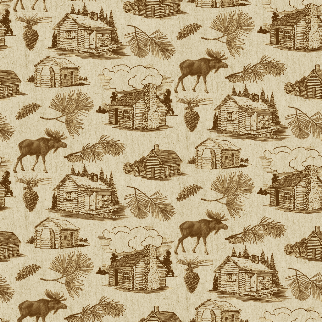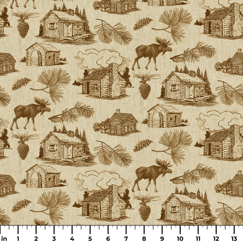 This rustic toile fabric features detailed sepia-toned illustrations of woodland cabins, majestic moose, and pine boughs scattered across a warm cream background. The vintage-inspired sketches capture the essence of mountain living with carefully rendered log cabins featuring stone chimneys and quaint windows. Perfect for creating cozy cabin quilts, rustic throw pillows, or lined curtains that bring wilderness charm to any space.