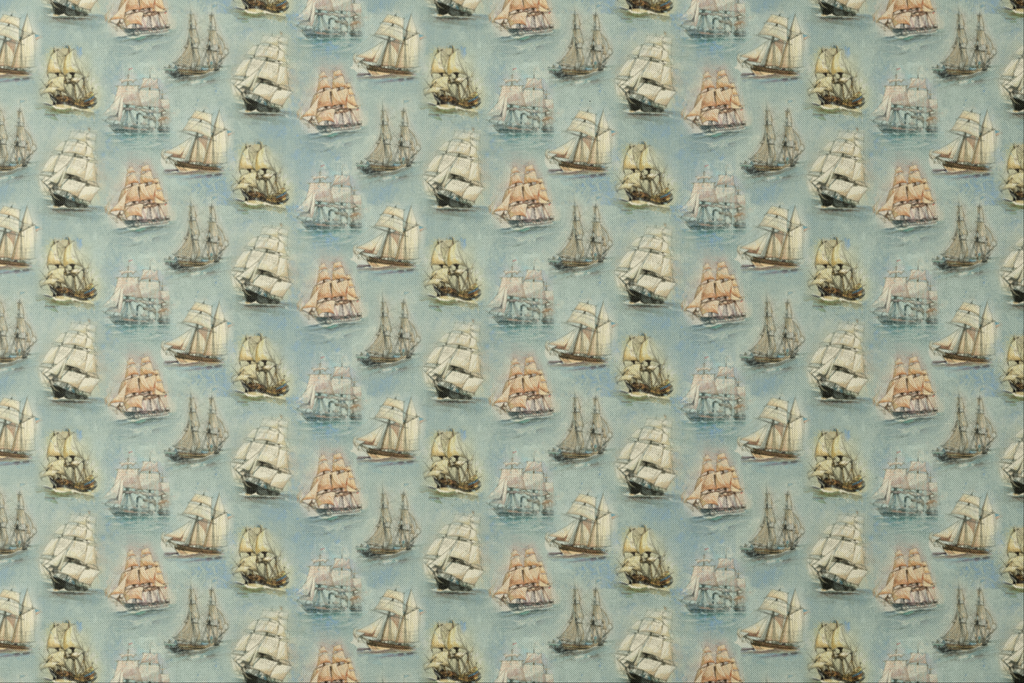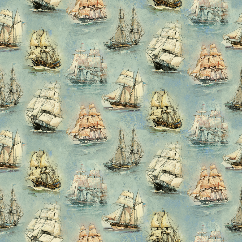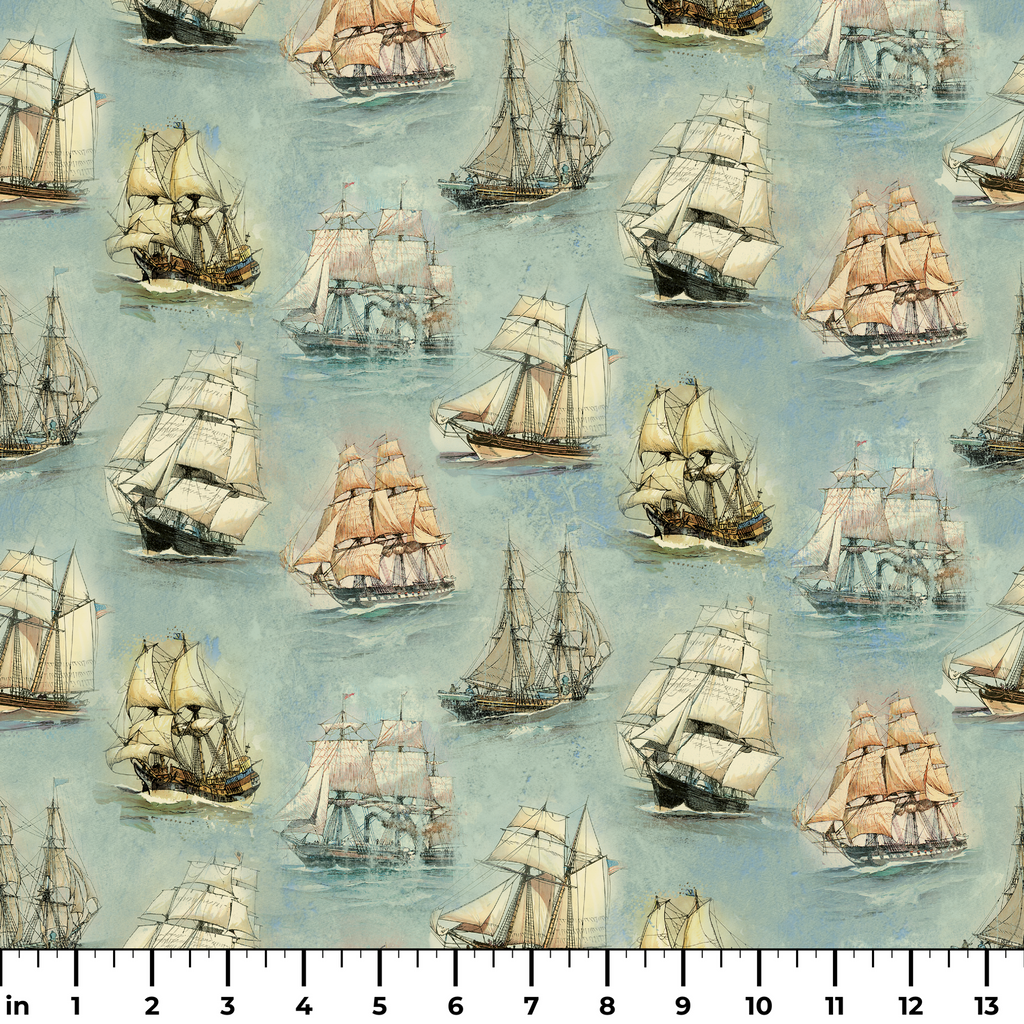 Majestic tall ships drift across a misty sea-green background in this enchanting nautical fabric. The vintage-inspired illustrations showcase various sailing vessels with billowing cream sails and detailed rigging, each one appearing to float independently on the watercolor-like surface. This maritime treasure would make stunning curtains in a coastal home or create unforgettable accent pillows for a nautical-themed room.