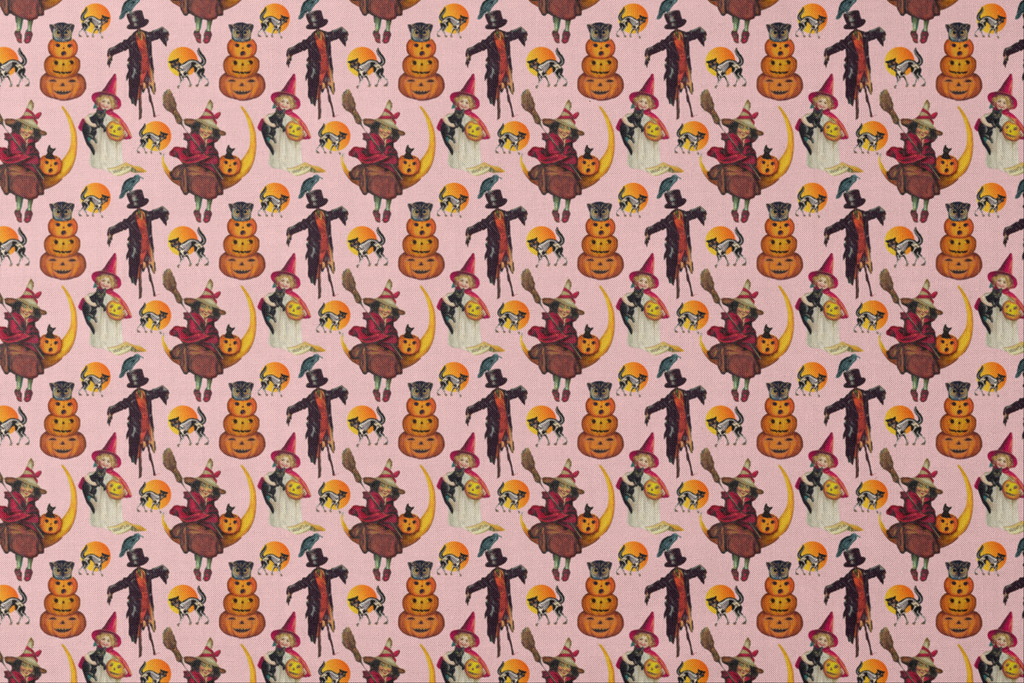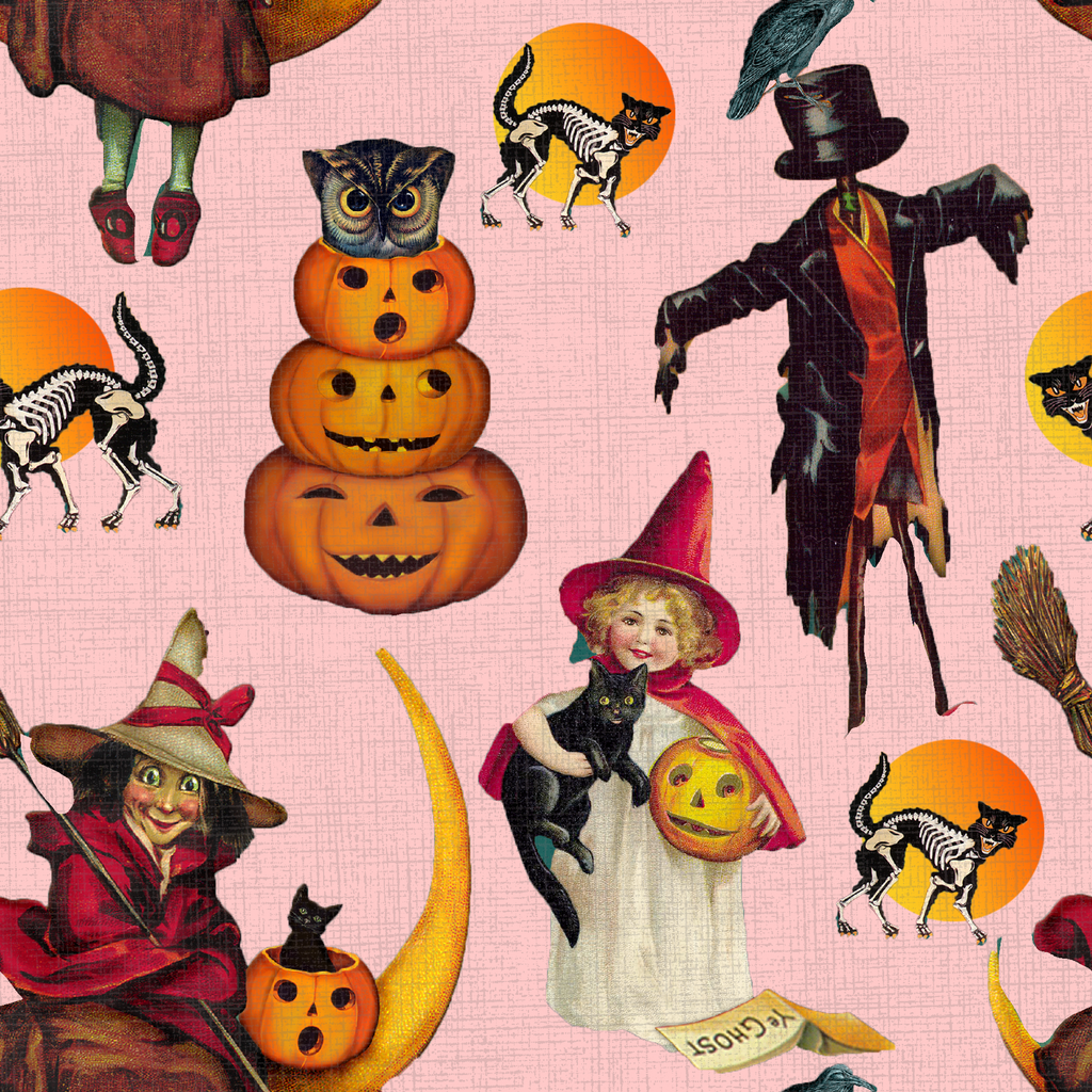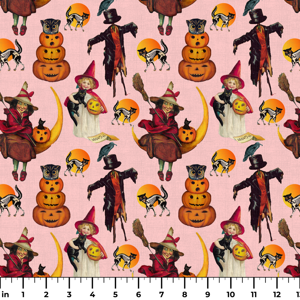 Step into a bewitching world of vintage-inspired Halloween charm with this whimsical fabric featuring classic spooky characters on a soft pink background. Stacked jack-o'-lanterns, skeleton cats with golden moons, scarecrows, and traditional witch imagery create a nostalgic collection of Halloween treasures with a distinctly retro vibe. This enchanting fabric would make delightful throw pillows for your October home decor or a show-stopping tote bag for trick-or-treating adventures.