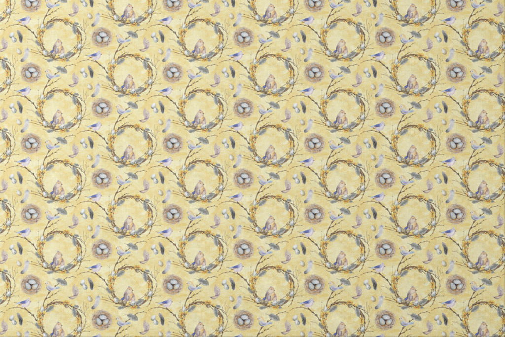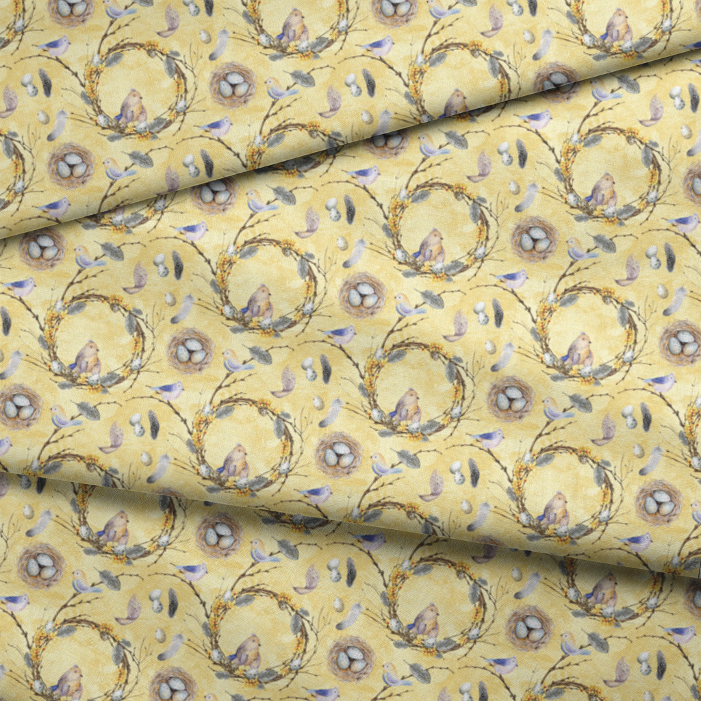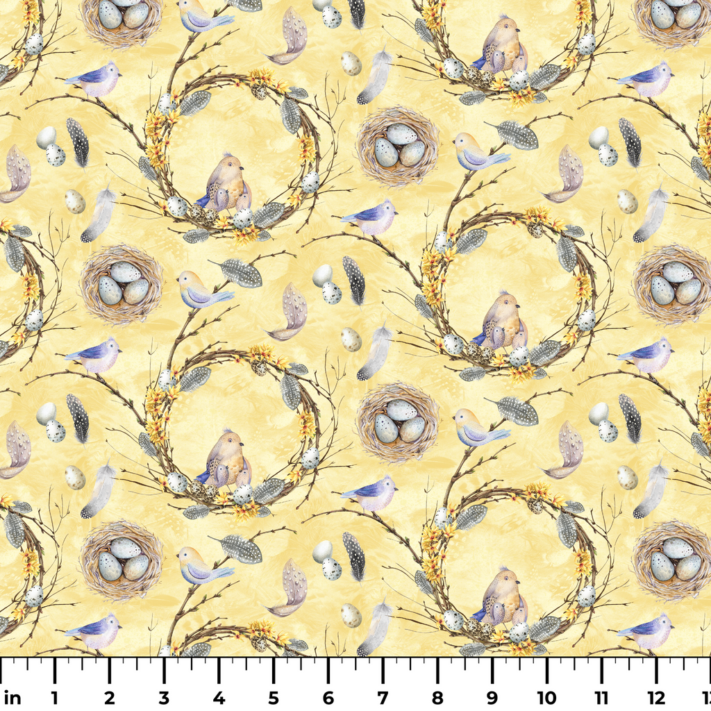 Delicate songbirds and intricately detailed nests grace this sunlit yellow fabric, creating a springtime sanctuary in textile form. Speckled eggs, wispy feathers, and twig wreaths adorned with tiny yellow blooms dance across the warm background, capturing the tender essence of new beginnings. The watercolor-style illustrations blend soft blues, creams, and natural browns for a peaceful yet cheerful aesthetic. Perfect for spring table linens or a nursery quilt that brings a touch of nature's wonder indoors.