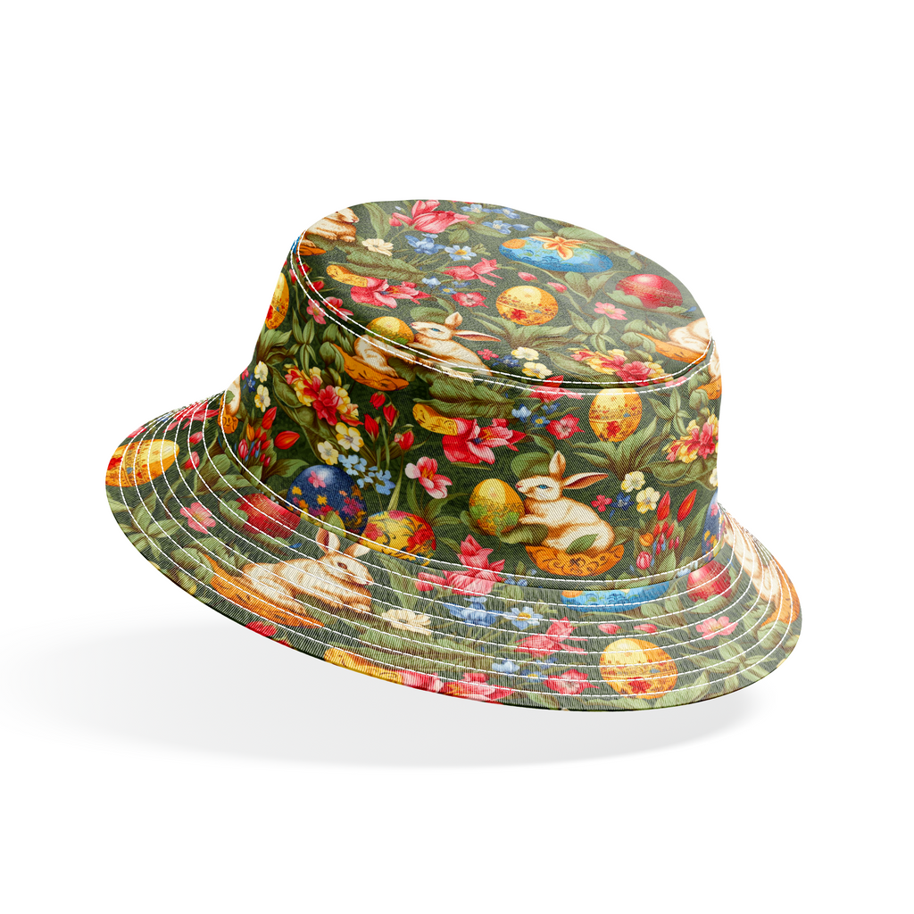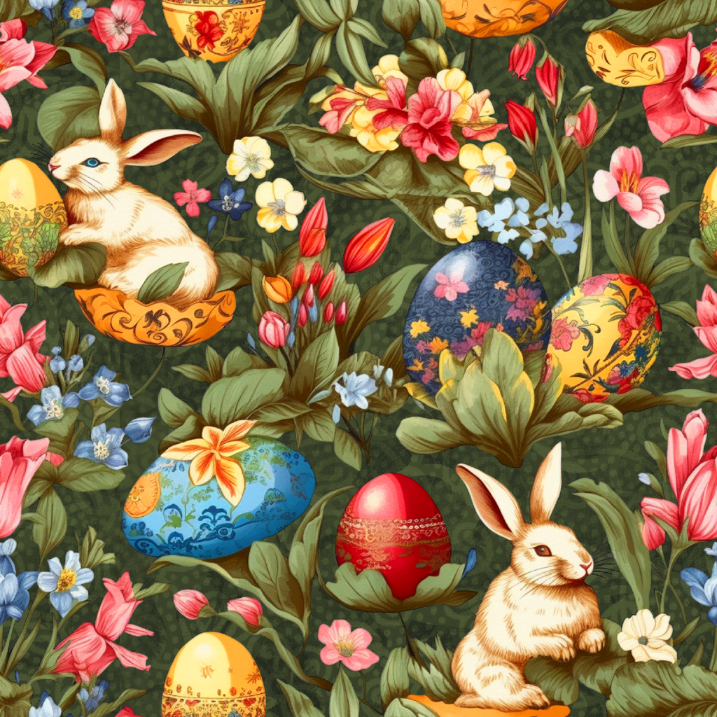 This enchanting Easter garden fabric features soft cream bunnies nestled among richly decorated eggs and blooming spring flowers against a deep forest green background. Ornate eggs in vibrant red, blue, yellow, and orange showcase intricate decorative patterns, while delicate pink tulips, blue forget-me-nots, and buttery yellow blossoms create a lush seasonal tableau. Perfect for creating festive table runners, Easter baskets, or spring-themed quilting projects that capture the magic of the season.