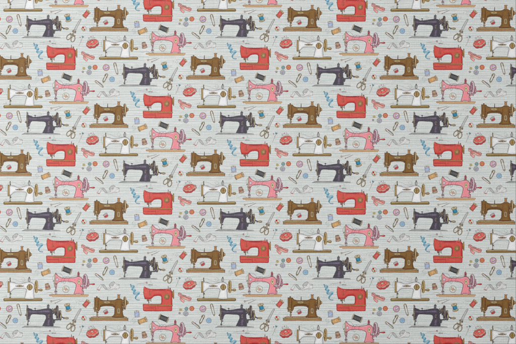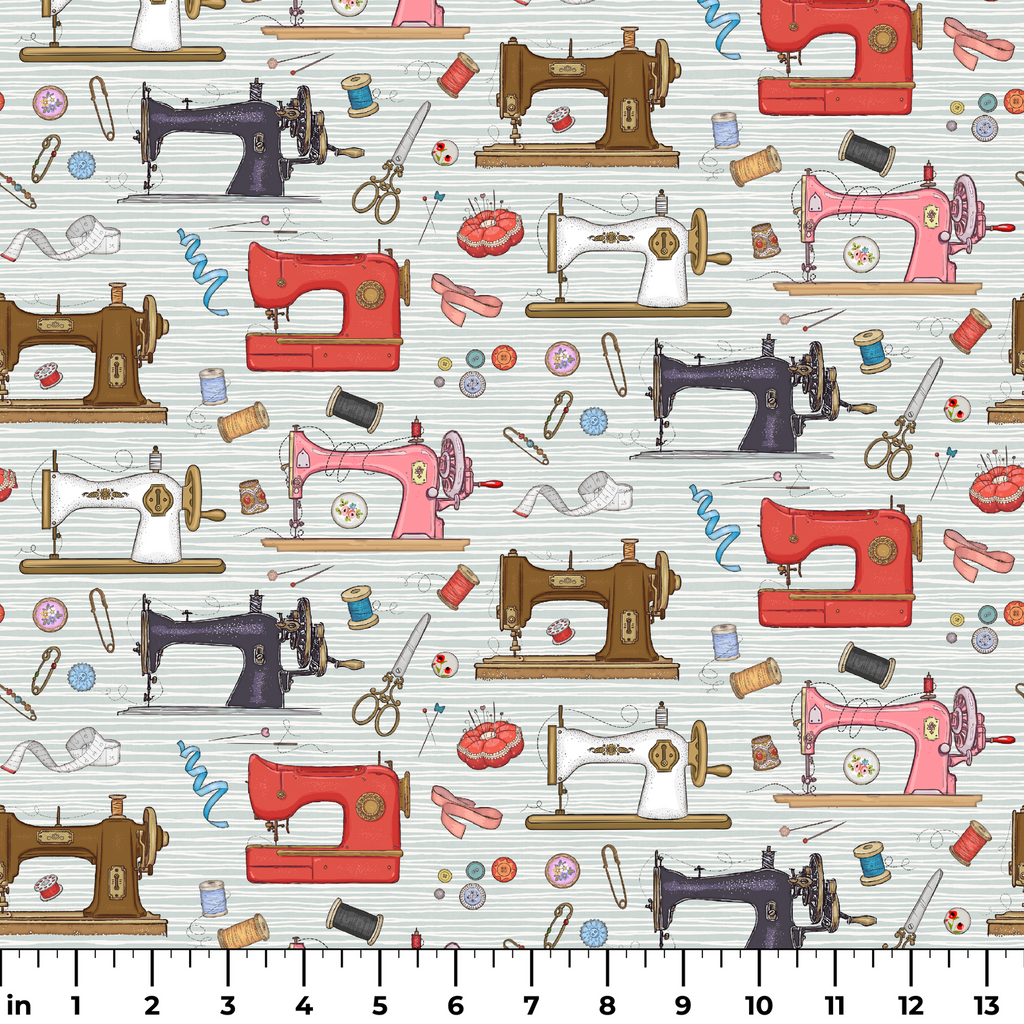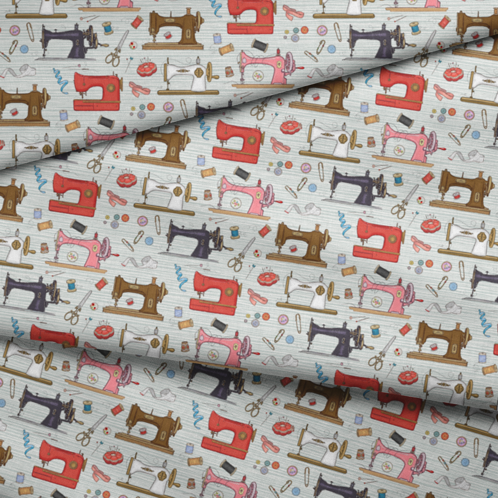 Charming vintage sewing machines in rich colors of cherry red, dusky pink, classic black, and warm wood tones dance across a backdrop of soft mint-green stripes. Scattered among the machines are all the essentials of a seamstress's toolkit—golden spools of thread, gleaming scissors, measuring tapes, and dainty pin cushions—creating a delightful celebration of the crafting spirit. This whimsical fabric perfectly captures the joy of sewing and would make an enchanting lining for a crafting tote or a statement apron for your sewing room.