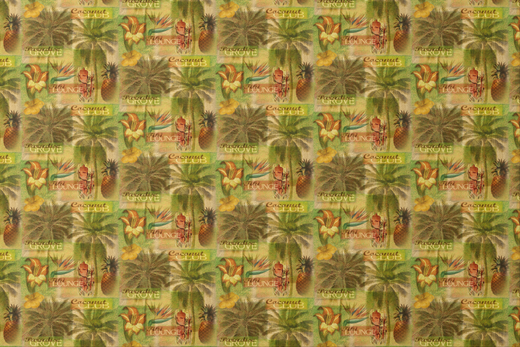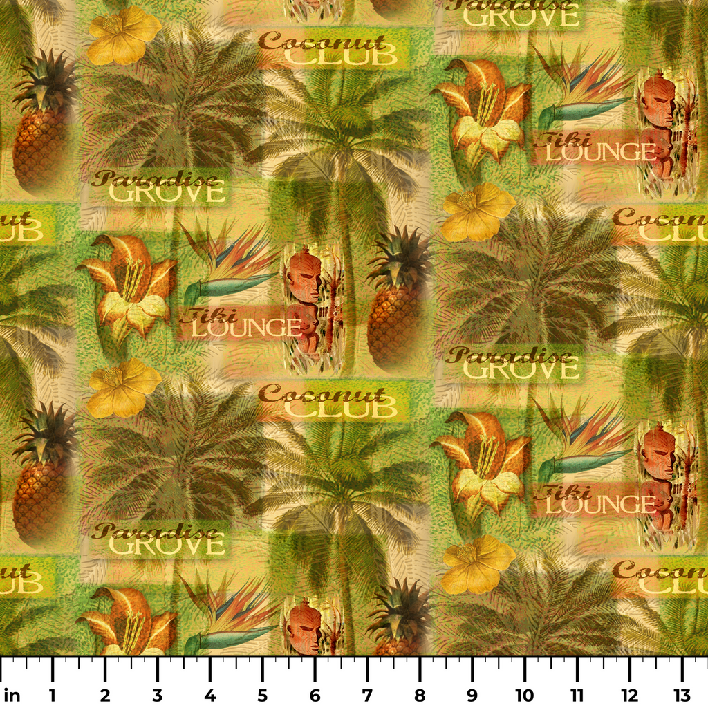 Transport yourself to a sun-drenched tropical paradise with this vintage-inspired tiki fabric. Lush palm fronds sway across a textured green background, complemented by golden hibiscus blooms, ripe pineapples, and exotic flowers in amber and coral hues. Nostalgic tiki lounge graphics and phrases like "Paradise Grove" and "Coconut Club" evoke the mid-century island aesthetic that brings warmth to any space. Perfect for creating statement cushions on a porch swing or fashioning a one-of-a-kind beach tote that stands out from the crowd.