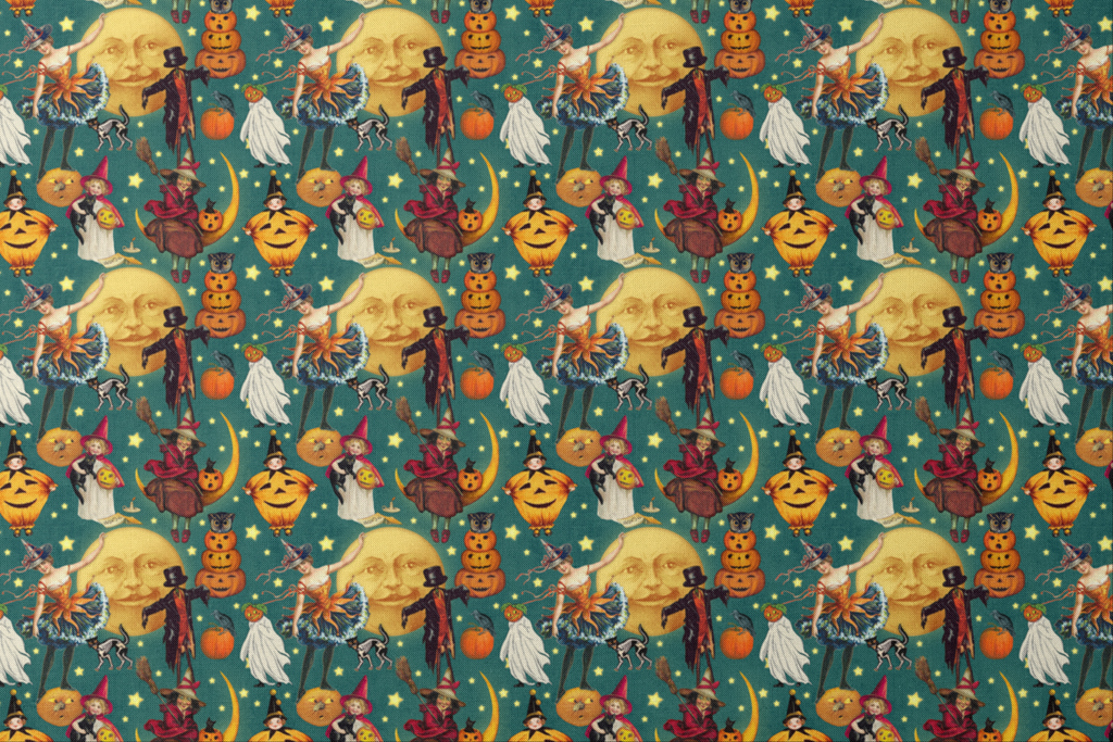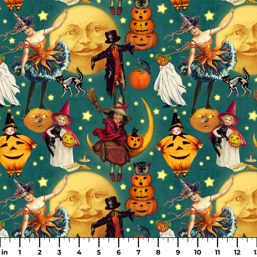 This enchanting vintage-inspired Halloween fabric features a rich teal background scattered with golden stars, showcasing a whimsical collection of classic Halloween imagery. The pattern bursts with nostalgic elements including jack-o'-lanterns, ghosts, witches riding broomsticks, skeleton cats, and a magnificent smiling moon that serves as the centerpiece. The rich color palette of orange, black, cream, and golden yellow creates a festive yet sophisticated Halloween aesthetic perfect for creating holiday table runners, trick-or-treat bags, or accent pillows for your autumn decor.