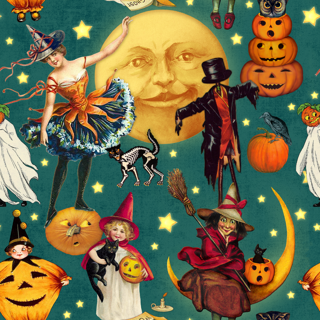 Kate Ward Thacker - Vintage Enchantment - Teal Halloween Collage Fabric