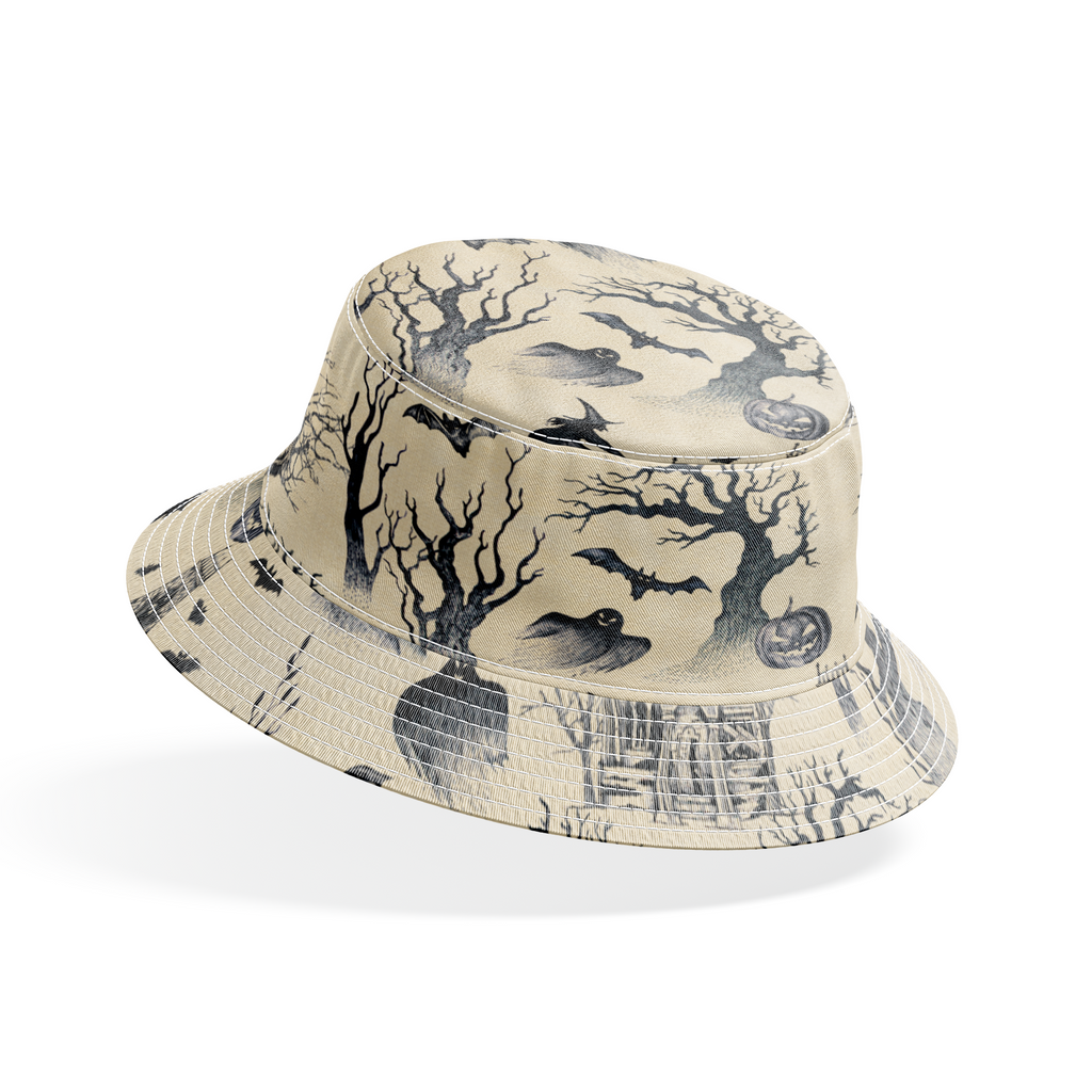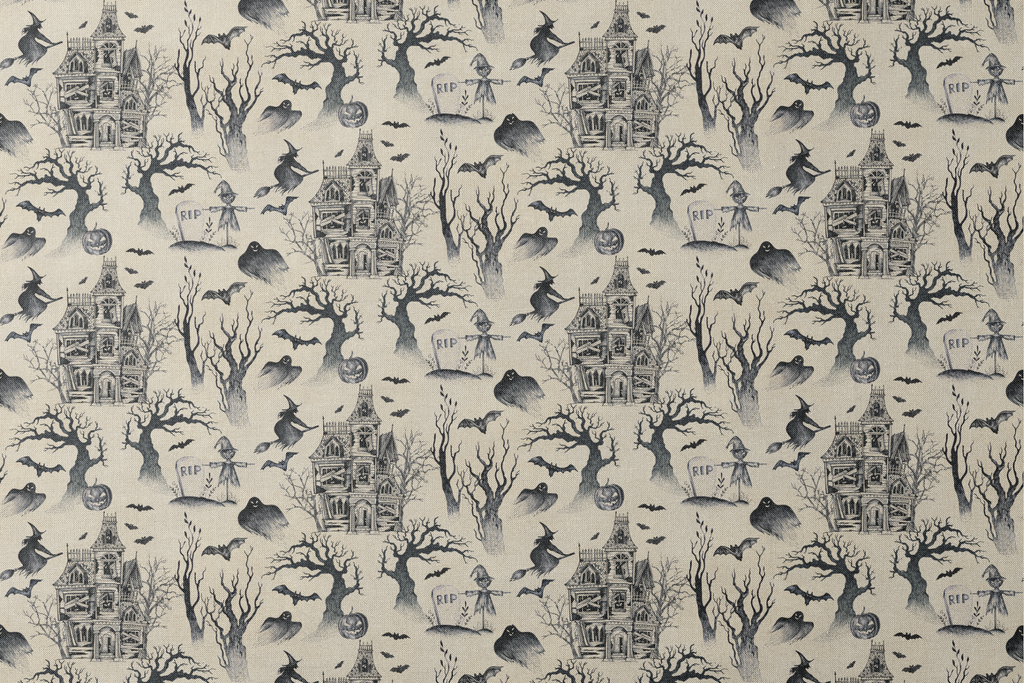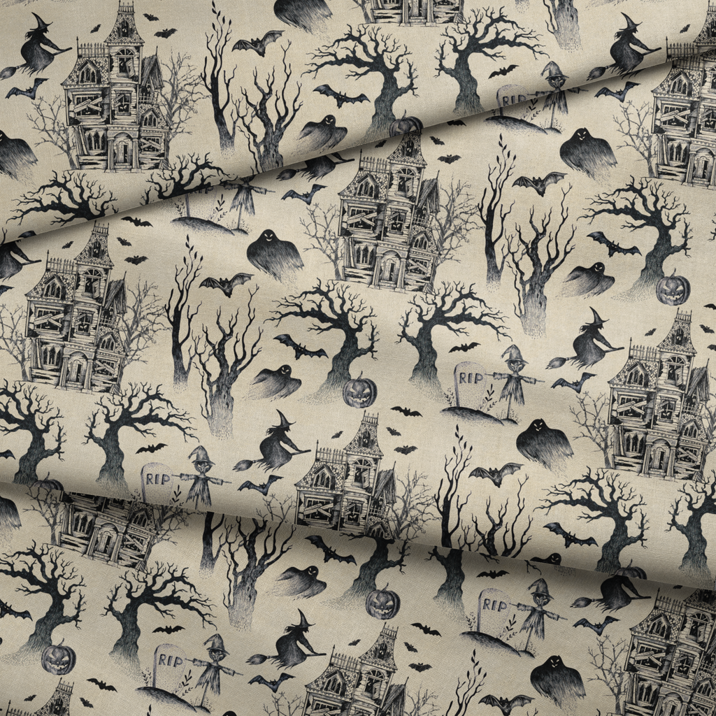 Spooky vintage Halloween pattern featuring haunted houses, witches on broomsticks, gnarled trees, jack-o'-lanterns, bats, and tombstones on a cream background. Perfect for any spooky season craft or decor.