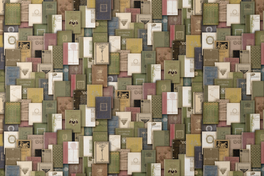 A mesmerizing collage of vintage book covers creates a bibliophile's dream in muted tones of sage green, dusty rose, and antiqued cream. The pattern showcases beautiful classic book spines and covers with decorative Art Nouveau details, floral emblems, and elegant typography that gives an impression of a well-loved library wall. Perfect for creating cozy reading nook cushions or lining the interior of a handcrafted journal cover that celebrates literary heritage.