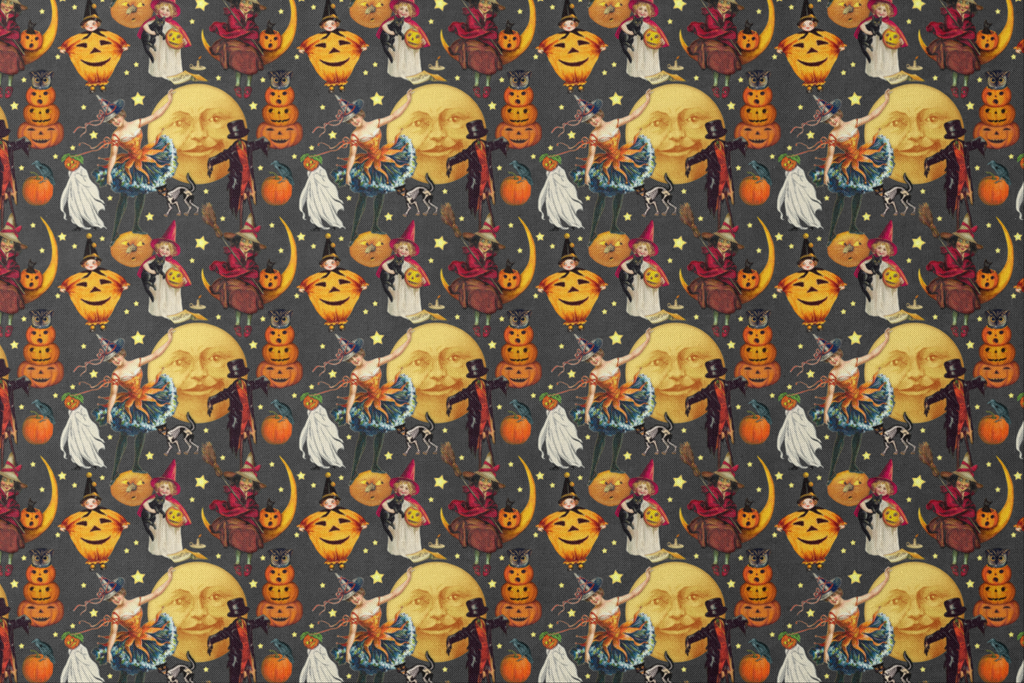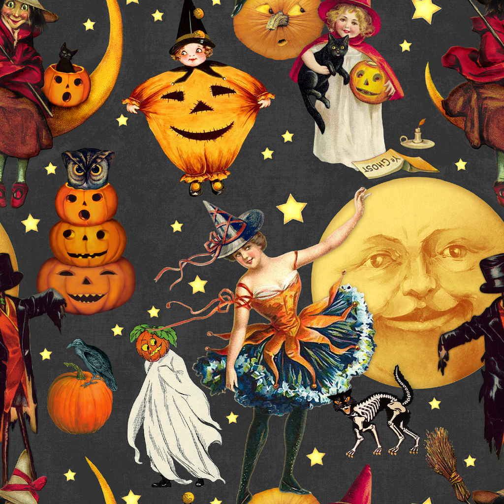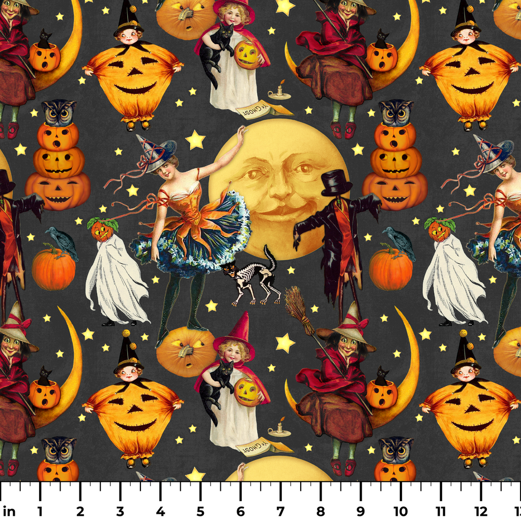 This enchanting vintage-inspired Halloween fabric features a charcoal gray background adorned with nostalgic illustrations of jack-o'-lanterns, moons, witches, black cats, and ghostly figures. Rich oranges, yellows, and deep reds pop against the moody backdrop, while scattered golden stars add a magical twinkle throughout the design. The whimsical Victorian-style imagery captures Halloween's playful spirit with stacked pumpkins, skeleton cats, and smiling moons that harken back to early 20th century holiday postcards. Perfect for creating statement Halloween decor pieces like table runners and throw pillows, or for crafting a show-stopping trick-or-treat bag that stands out in the neighborhood.
