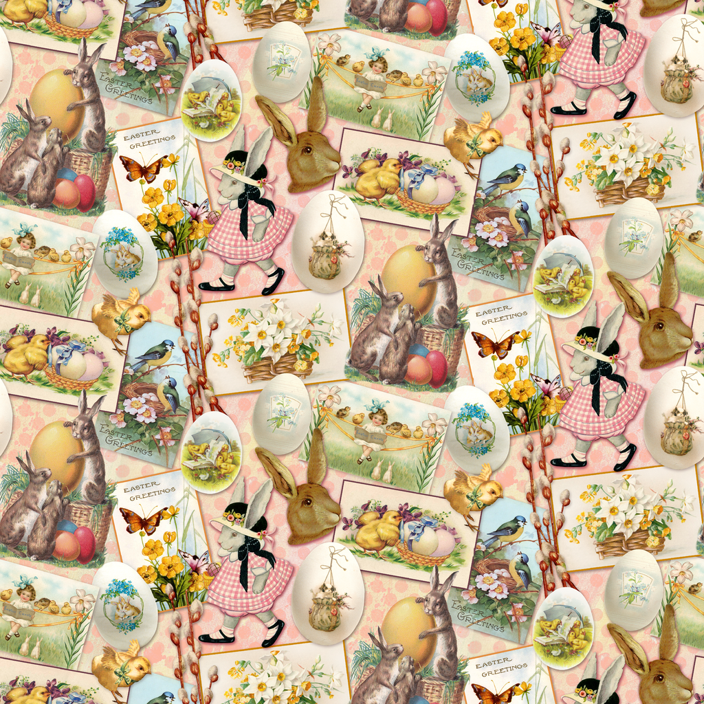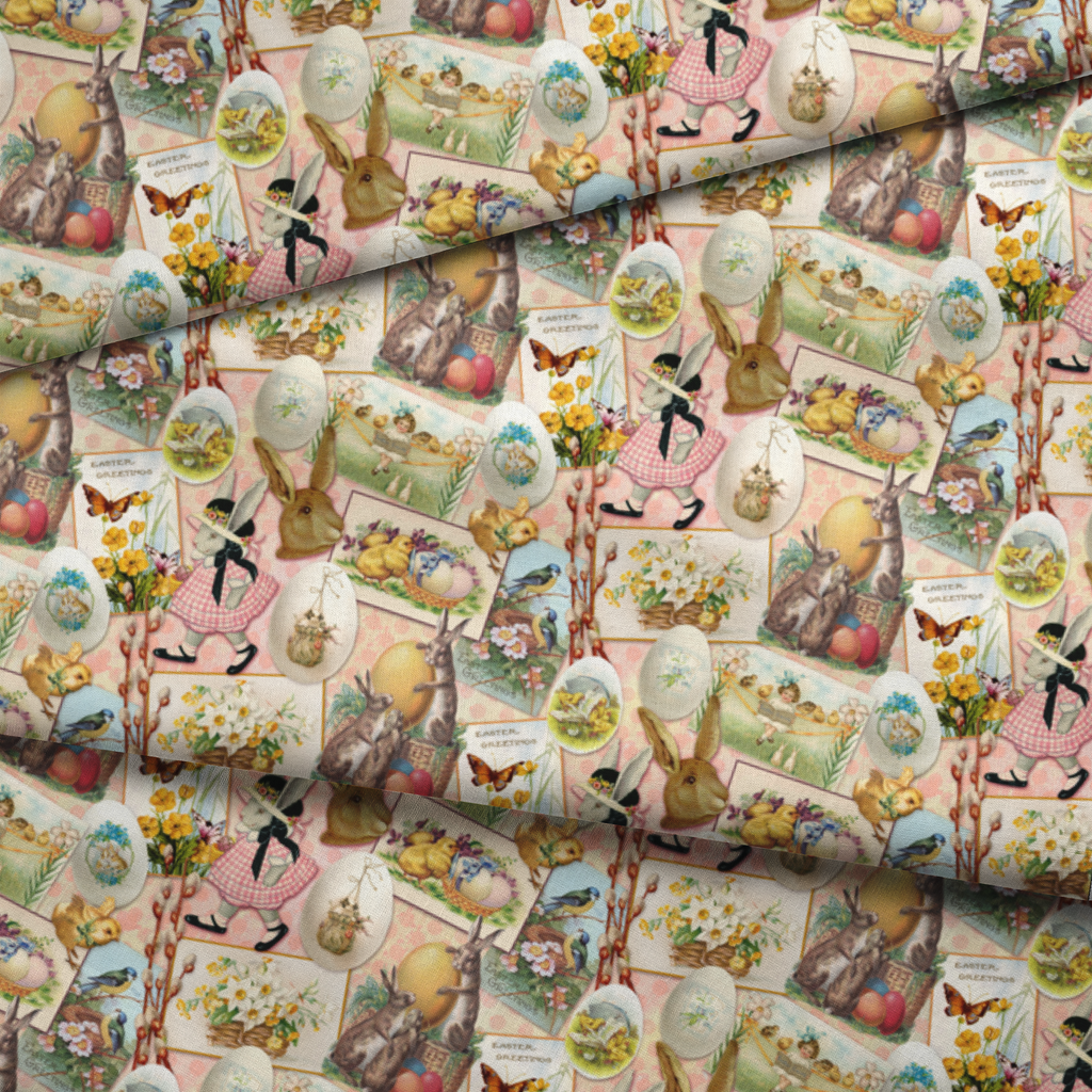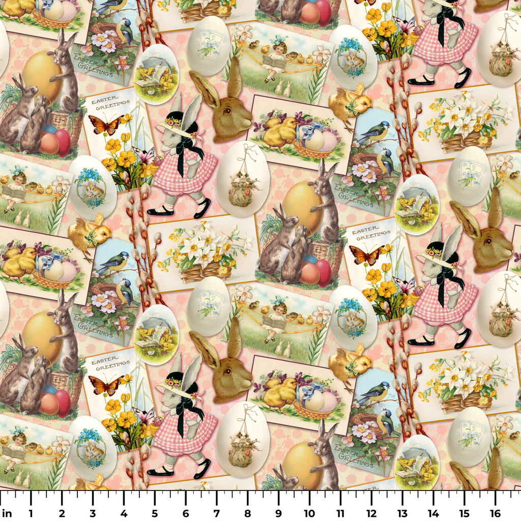 A charming collage of vintage Easter postcards dances across a soft pink background, featuring fuzzy bunnies, fluffy yellow chicks, decorated eggs, and spring blooms in a nostalgic palette of pastels and warm browns. Delicate illustrations of daffodils and cheerful songbirds nestle alongside whimsical Easter greetings that evoke the sweet simplicity of bygone celebrations. This enchanting fabric would make delightful Easter table runners, spring throw pillows, or a precious lining for children's Easter baskets.