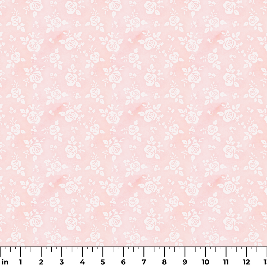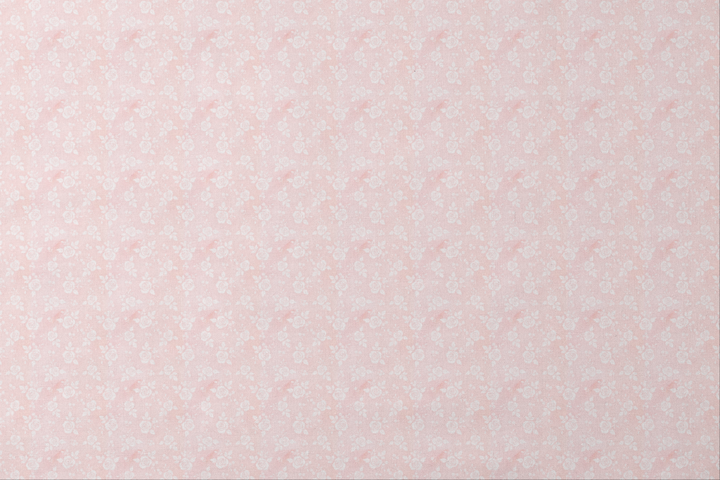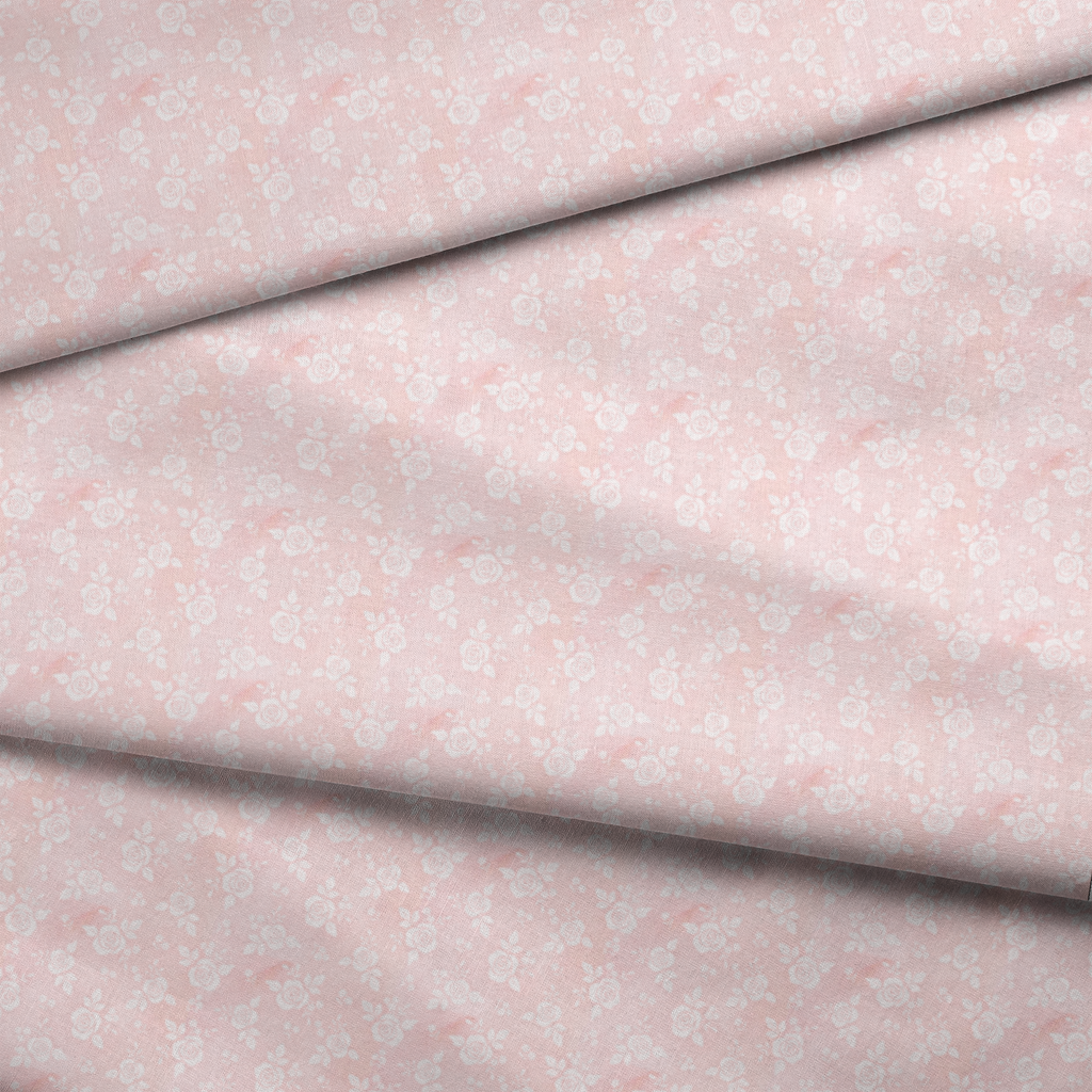 Delicate white roses bloom against a dreamy blush pink background, creating a soft, romantic pattern that feels like a whisper of spring. The stylized roses with their spiral centers are accompanied by dainty scattered flowers and leafy sprigs, all rendered in crisp white against the gentle pink backdrop. This enchanting fabric would make a stunning lining for jewelry boxes or a sweet accent for nursery projects, bringing a touch of grace to your handmade creations.