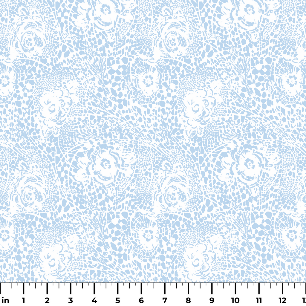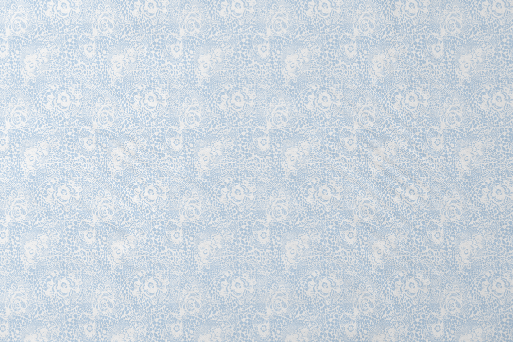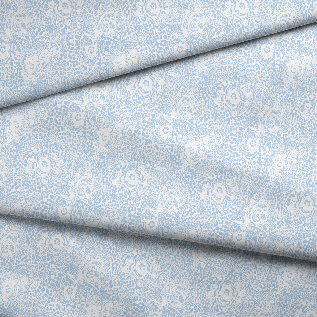 Delicate light blue floral pattern with an intricate lacework design. This contemporary botanical print features elegant swirling roses and detailed organic shapes in a soothing monochromatic palette.