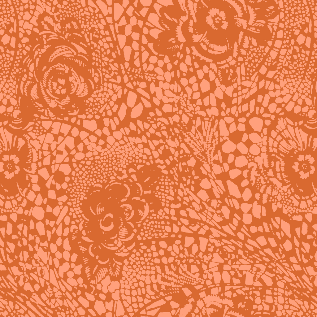 This vibrant orange floral pattern features an intricate lace-like design with textured roses and organic swirls creating a romantic, vintage-inspired look perfect for contemporary spaces.