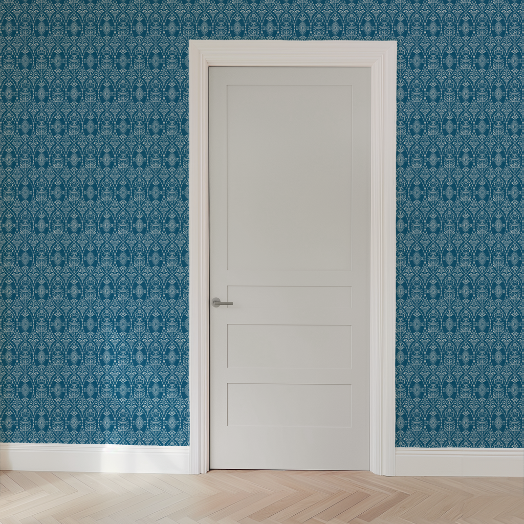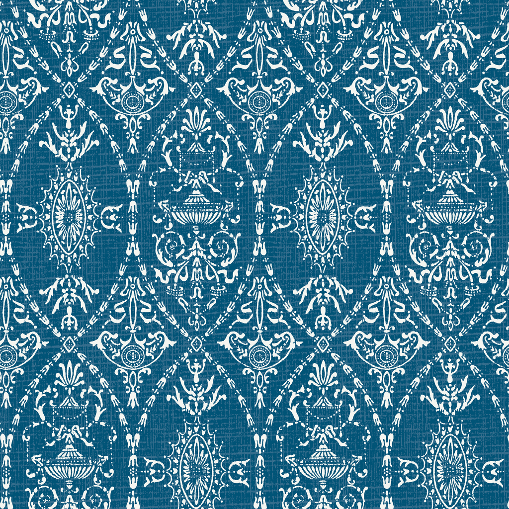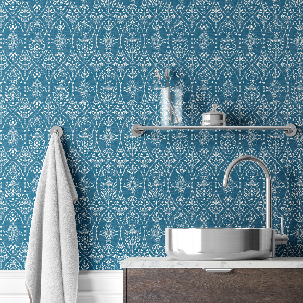 Elegant damask pattern in rich teal blue with intricate traditional motifs creates a timeless heritage look perfect for home decor in elegant formal spaces.